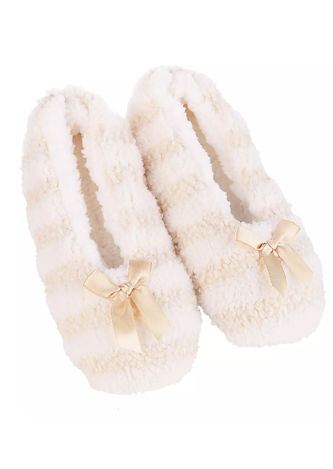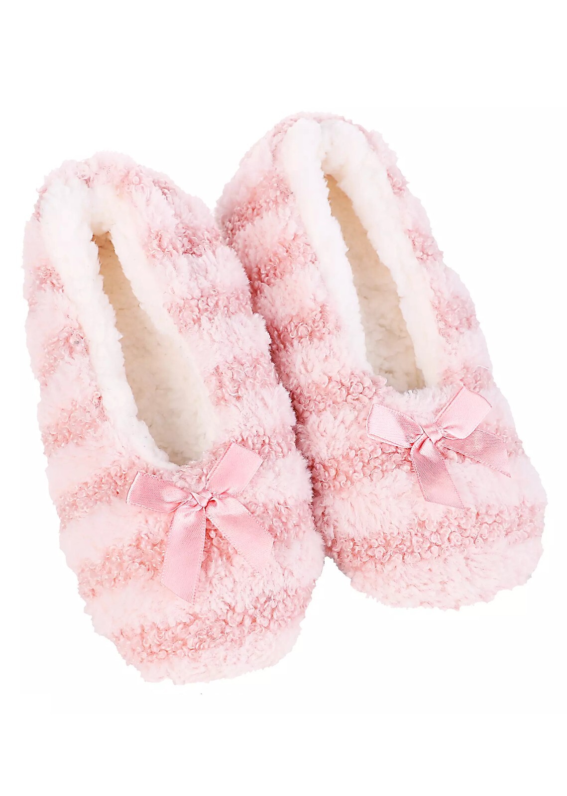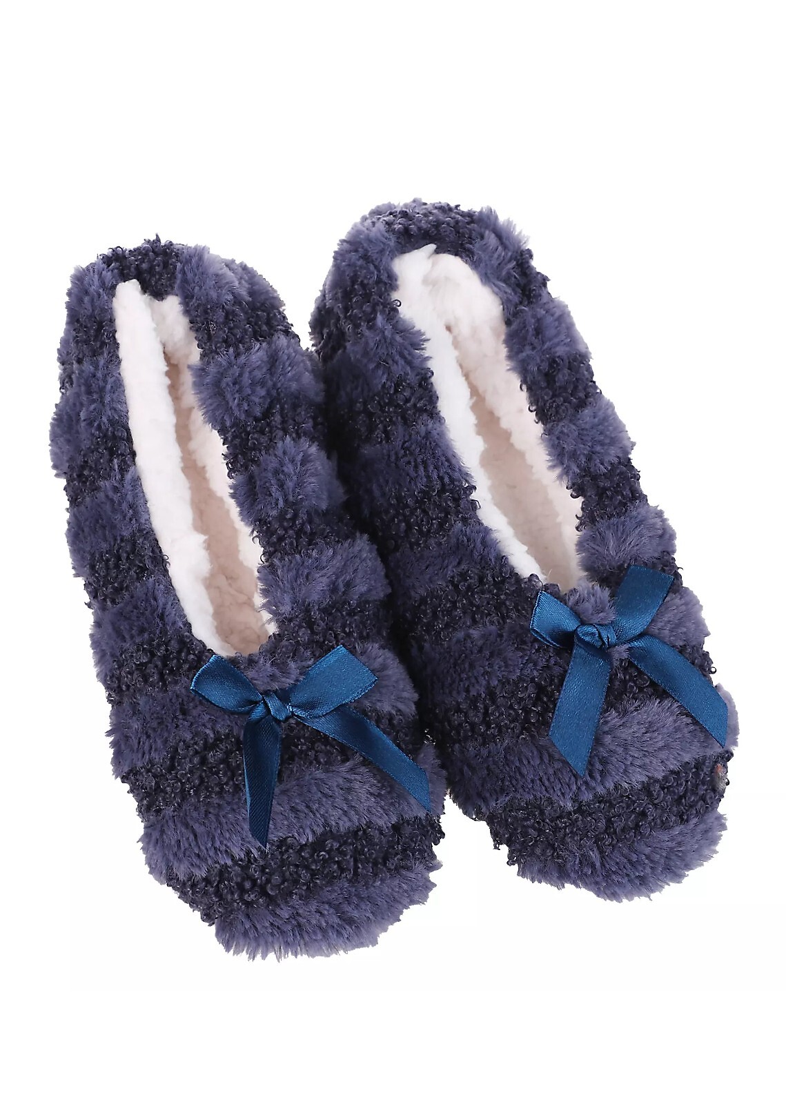 Dámské pantofle - střih baletních pantoflí - měkký úplet - vzor s vyvýšenými pruhy, ozdobná saténová mašle - nadýchaný měkký úplet na vnitřní straně - mírně vyztužený, protiskluzová úprava paty - dostupné barvy: ecru, růžová, jeans - vybrány náhodně Složení: 100% polyester