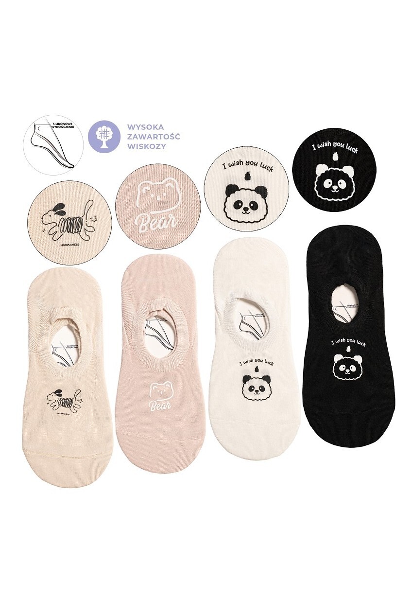 Dámské balerínky - směs viskózy a dalších vláken - zdobené zvířecím potiskem - ploché švy, nekompresní manžeta - silikon na vnitřní straně paty proti uklouznutí - dostupné barvy: ecru, béžová, černá, pudrově růžová Složení: 65% viskóza, 30% polyamid, 5% elastan