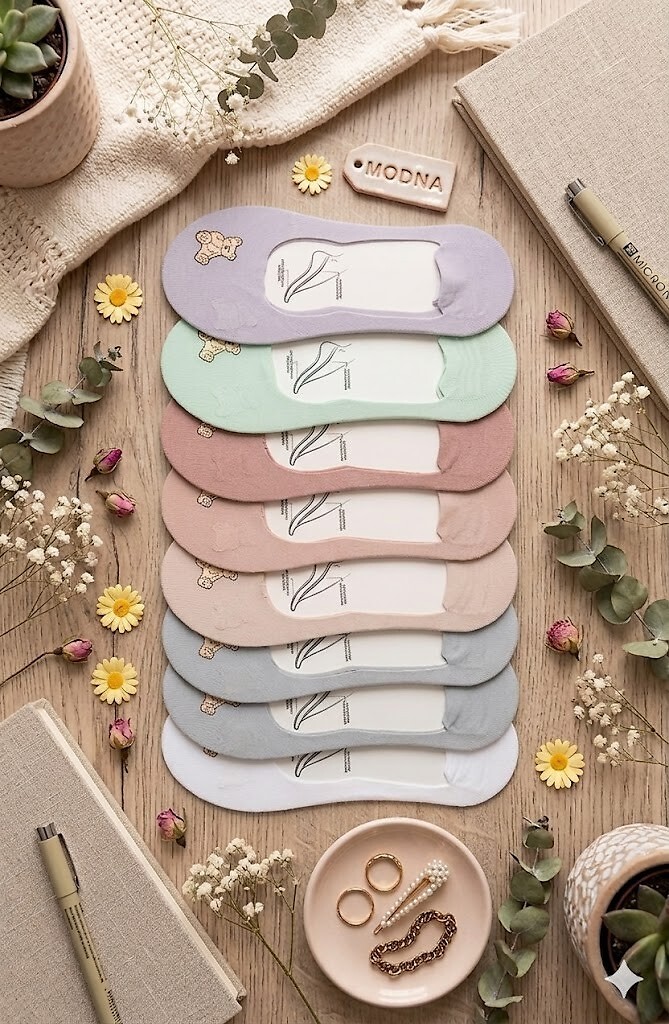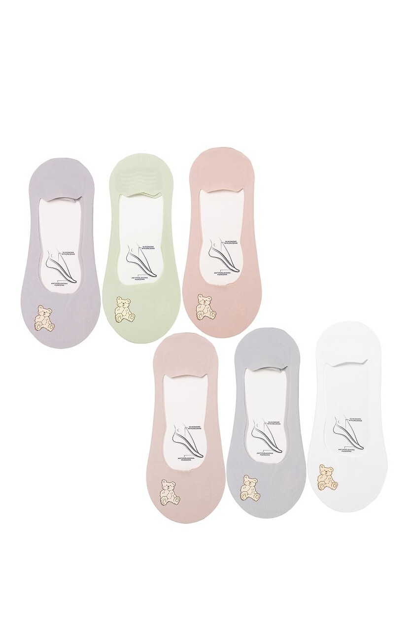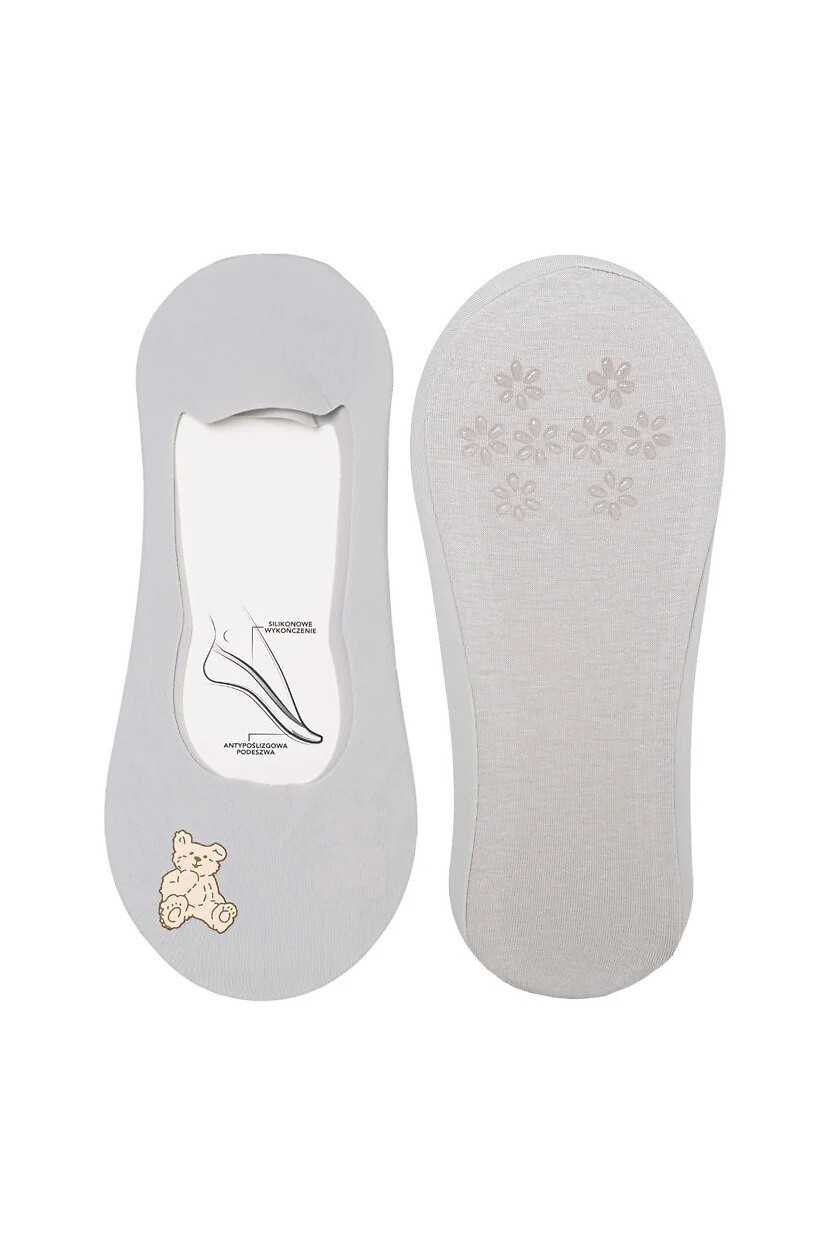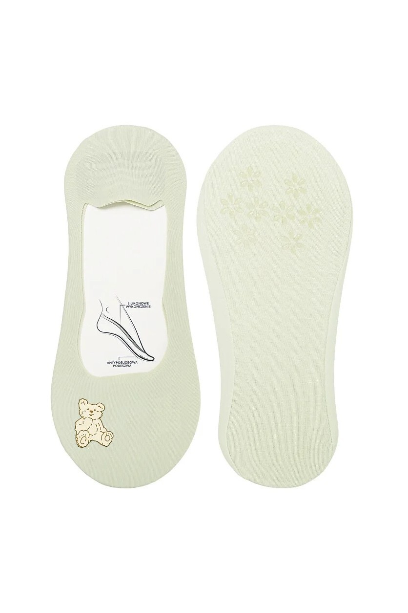 Dámské baleríny - tenký, průhledný materiál - zdobené barevným potiskem medvídka - plochá, nepostřehnutelná laserová úprava - silikon na patě proti uklouznutí - chodidlo z hladké bavlny s ABS - dostupné barvy, vybrané náhodně: bílá, olivová, šedá, vřesová, béžová, pudrově růžová Složení: svršek 79% polyamid, 21% elastan; podešev 95% bavlna, 5% elastan