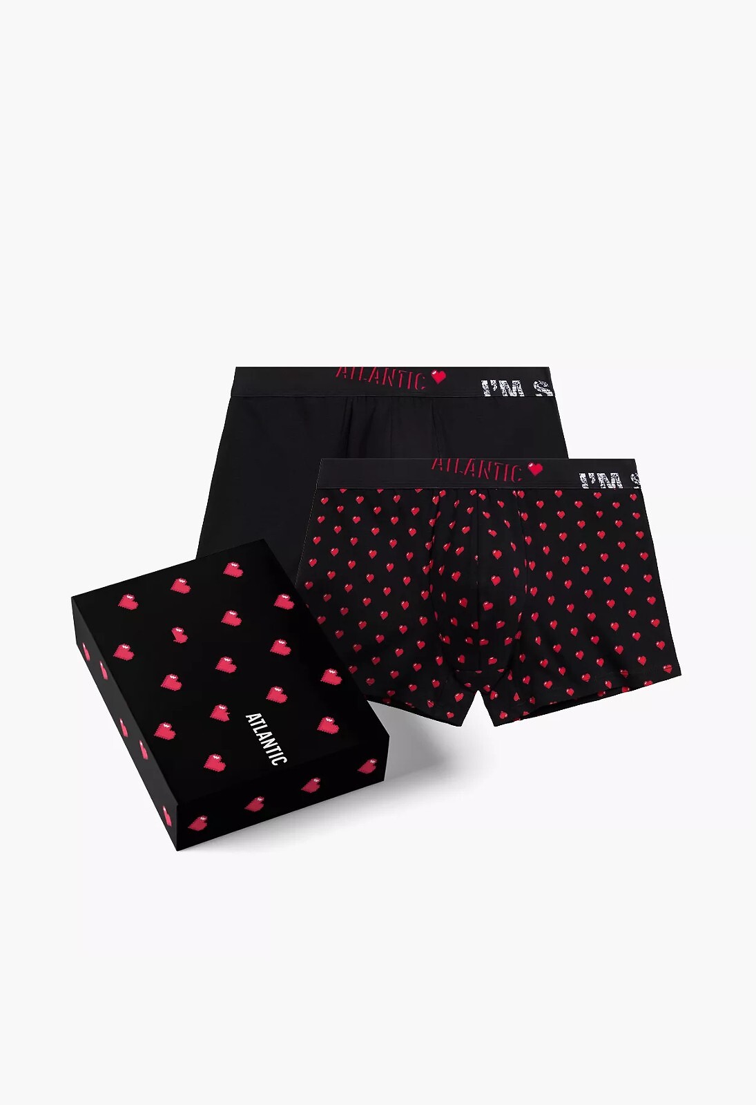 Pánské boxerky - vysoce kvalitní bavlna - zdobené barevným vzorem srdce - široký elastický pas s nápisem "ATLANTIC" - baleno v krabičce po dvou kusech Složení: 95% bavlna, 5% elastan