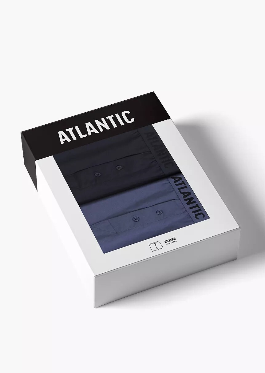 Pánské boxerky volného střihu - hladká bavlna - široký elastický pas s logem ATLANTIC - zapínání na knoflíky - baleno v krabičce po dvou Složení: 100% bavlna