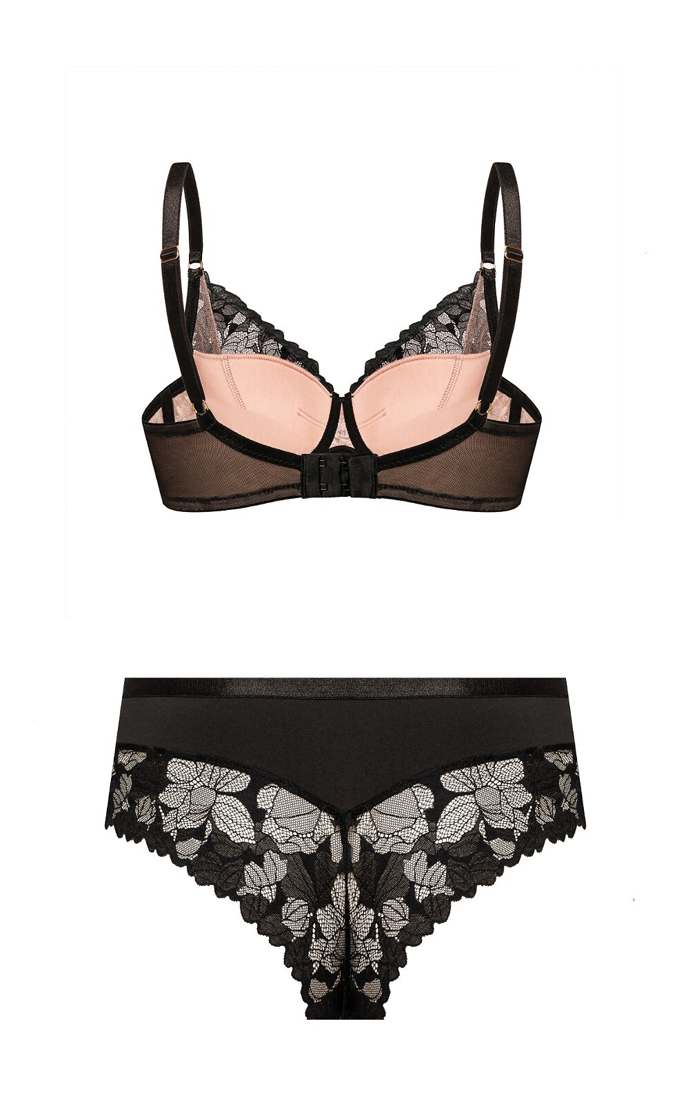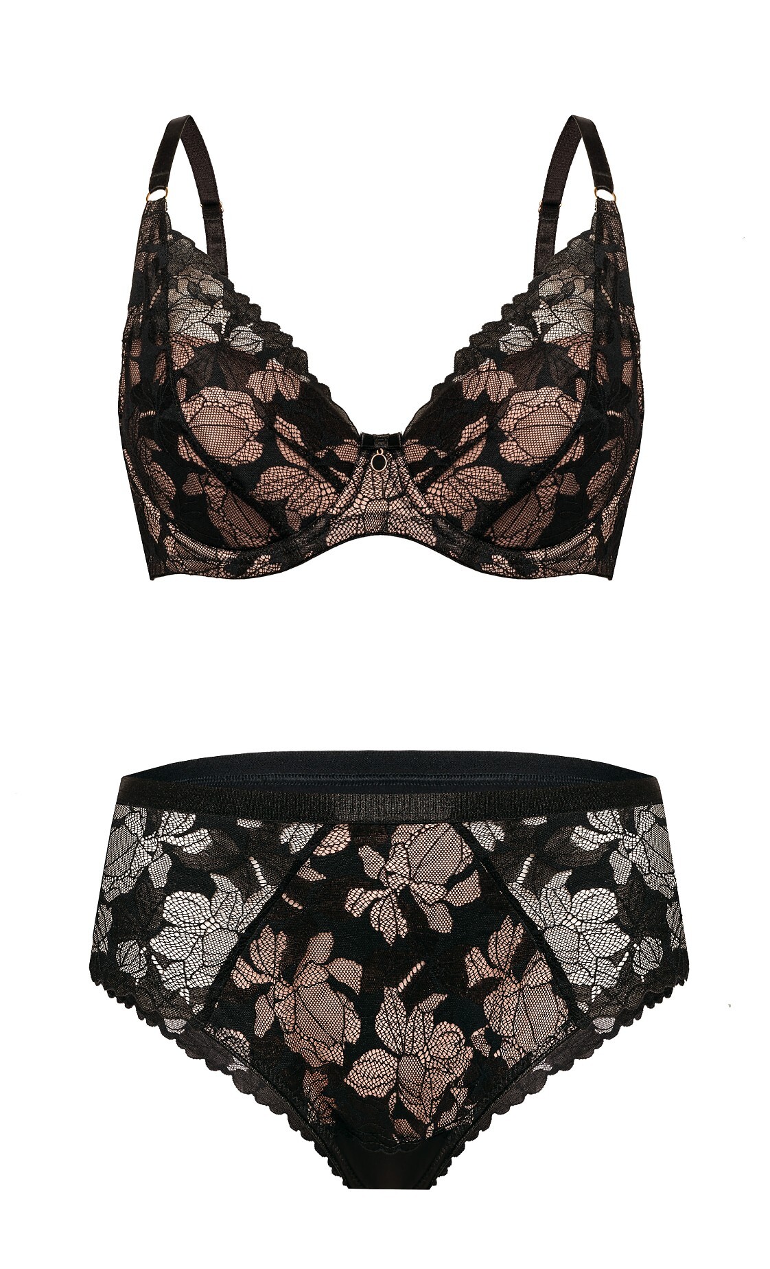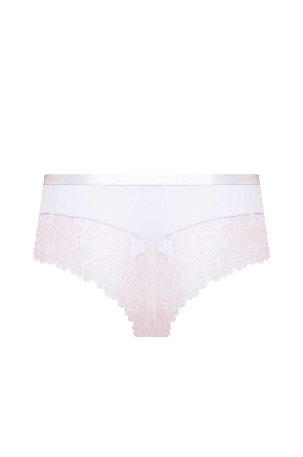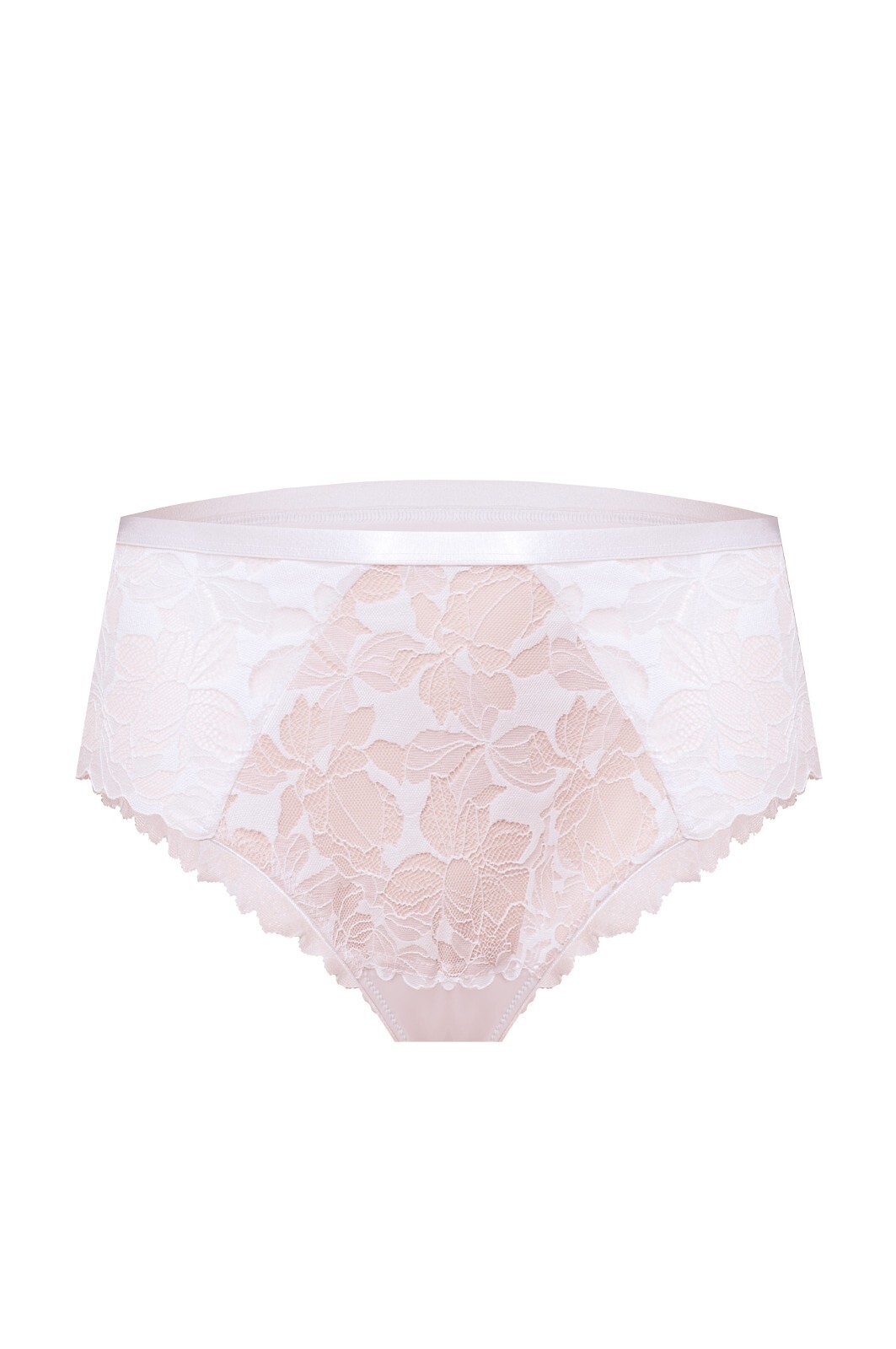 Dámské brazilské kalhotky s vysokým pasem - vyrobené z jemné květinové krajky s béžovou síťovinou - široké, zakryté boky - přední strana zdobená plochou gumičkou - zadní strana zakončená krajkou, odhalující hýždě Složení: 80% polyamid, 15% elastan, 5% bavlna