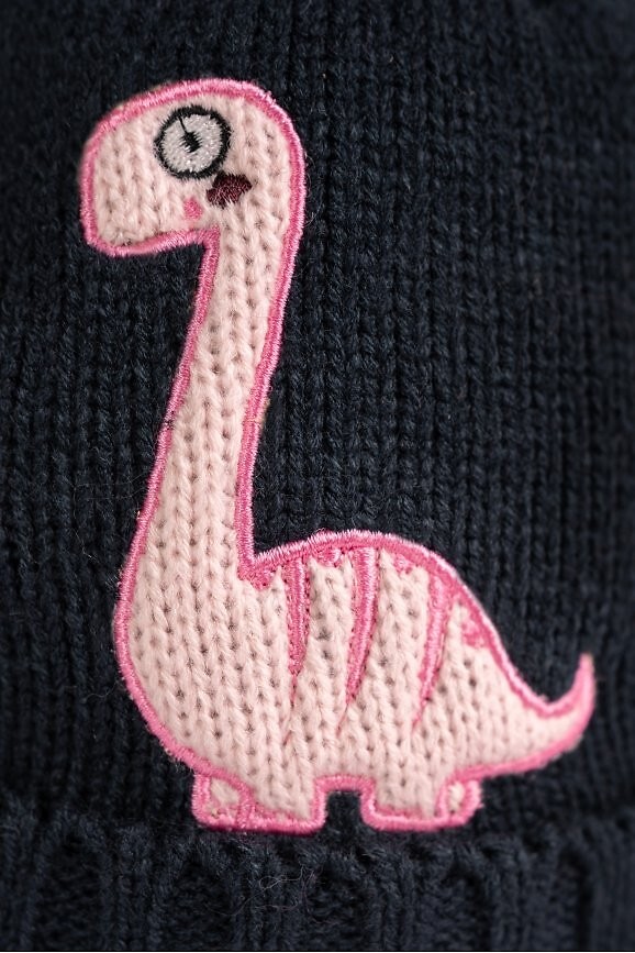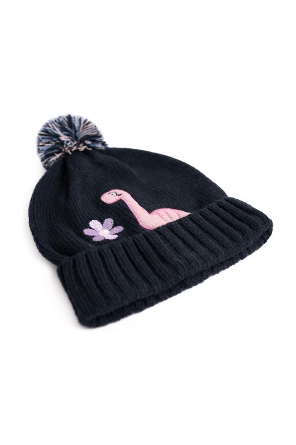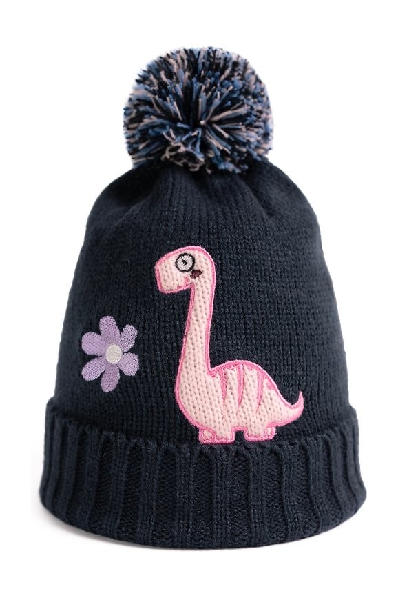 Dětská čepice s bambulkou - zdobená motivem dinosaura - mírně pružná - jednovrstvá bez dodatečného zateplení - vyrobena ze syntetického, nesvědivého materiálu Složení: 100% akryl