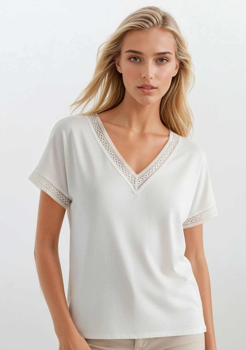 Dámská halenka - z měkké, elastické viskózy - výstřih do V - krátké rukávy - výstřih a rukávy zakončené prolamovanou stuhou - ležérní, volný střih - ideální pro ležérní styling Složení: 90% viskóza, 5% polyamid, 5% elastan