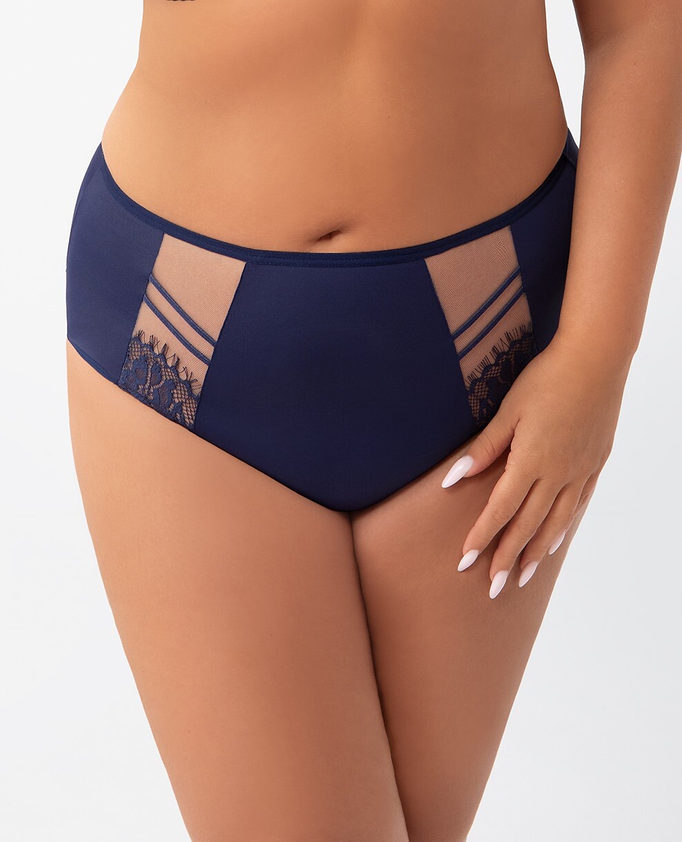 Dámské kalhotky - s plným a uzavřeným střihem - vyrobené z jednotného tmavě modrého mikrovlákna - přední strana je zdobena průhlednými síťovanými vsadkami s efektní krajkou a ramínky - zadní strana s tylovým lemem Složení: 90% polyamid, 7% elastan, 3% polyester
