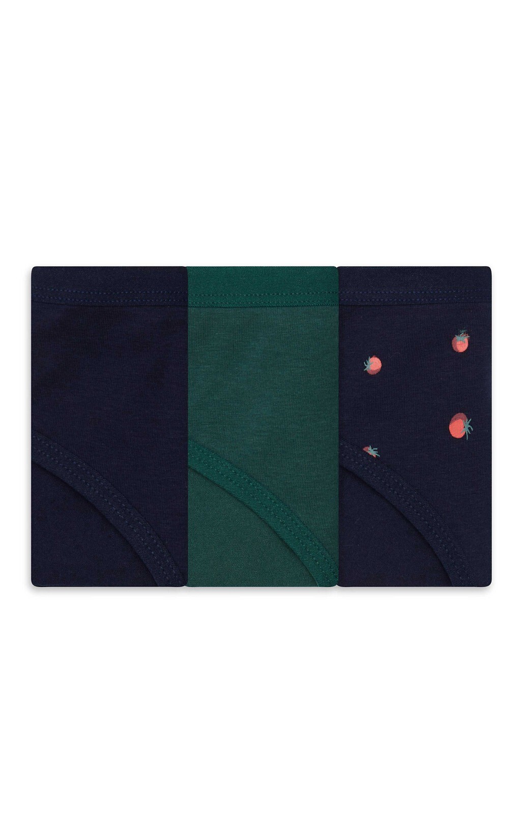 Dámské kalhotky z bavlny - zdobené motivem ovoce - klasický střih, bikiny - lehce zakryté boky - baleno v krabičce po třech kusech v barvách: tmavě modrá, zelená, černá Složení: 95% bavlna, 5% elastan
