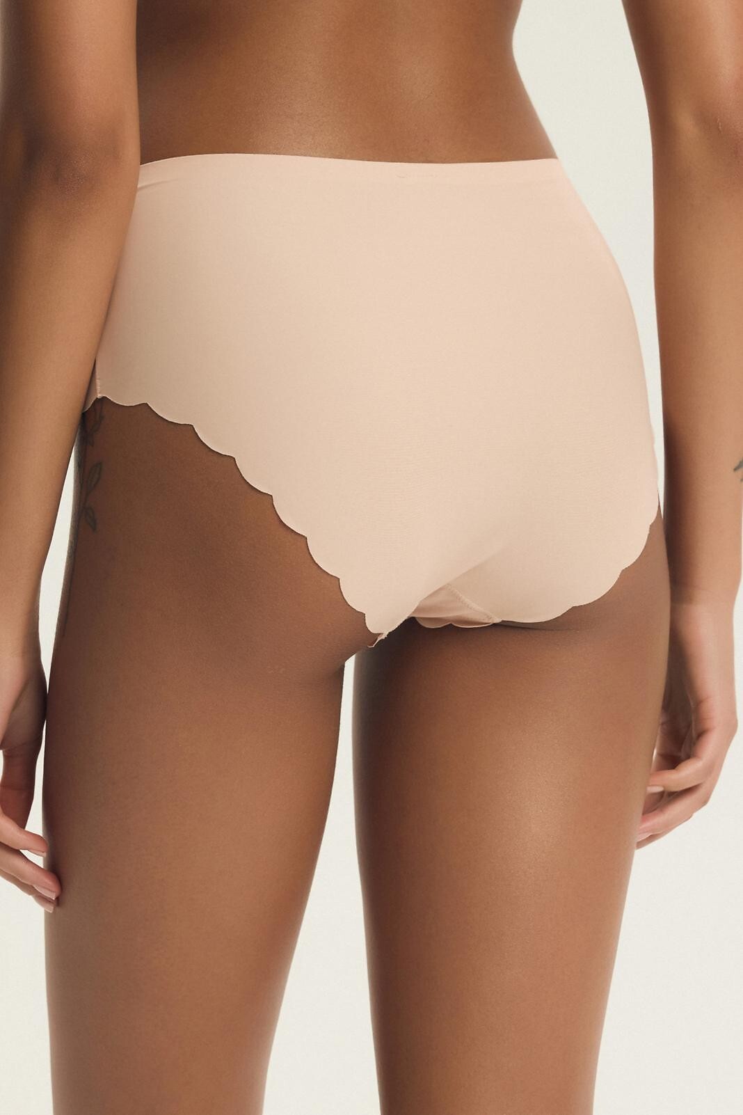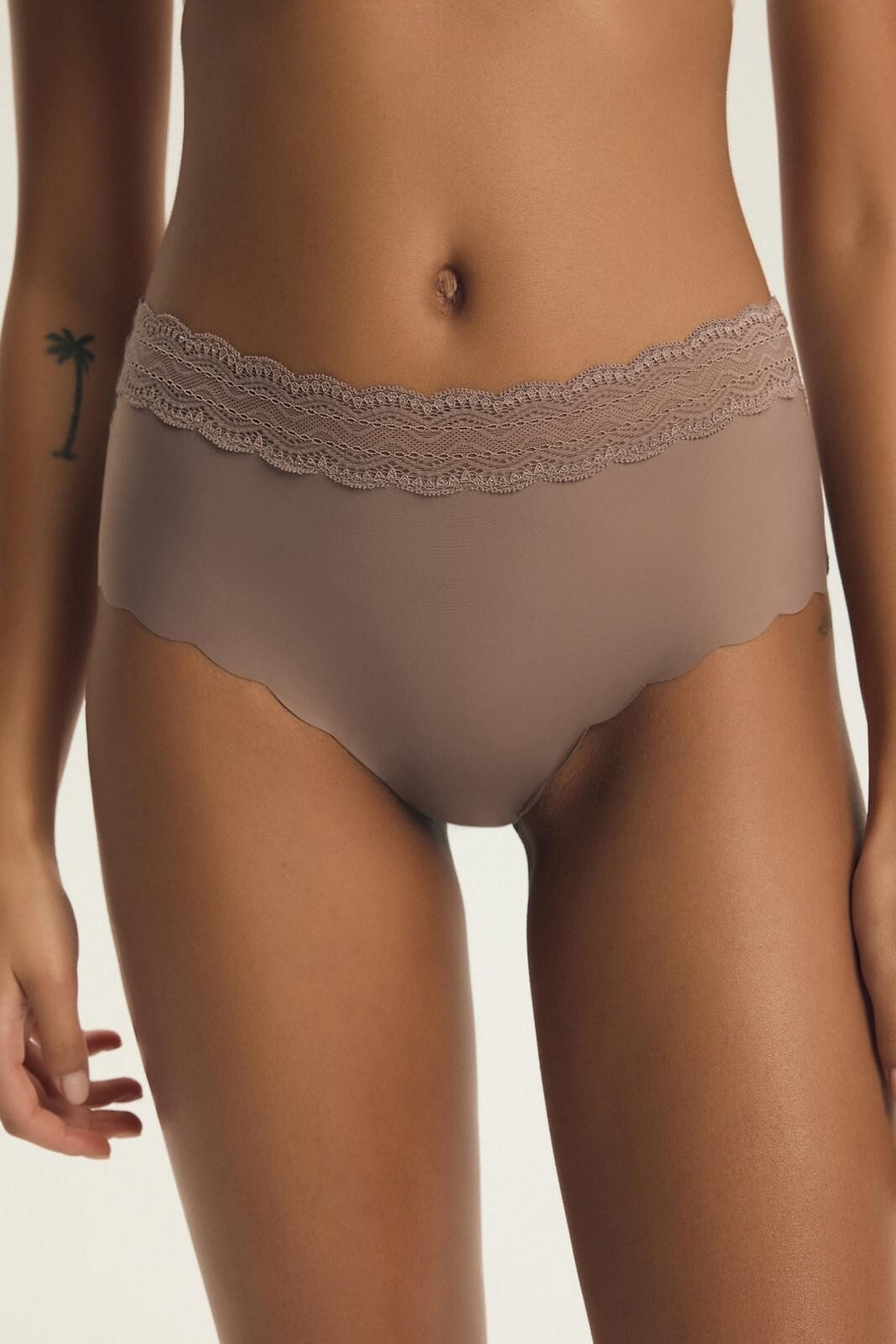 Dámské kalhotky - jemný, lehký, prodyšný materiál - široká, prolamovaná krajka v pase - laserem řezané nohavice - širší linie boků - baleno v krabičce po dvou kusech v béžové a cappuccino barvě Složení: 88% polyamid, 12% elastan
