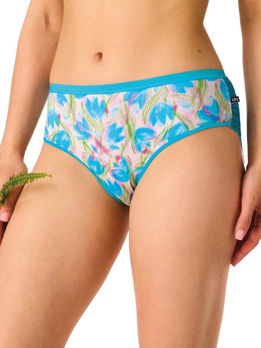 Dámské midi bikinové kalhotky - vyrobené z vysoce kvalitní bavlny - barevný květinový vzor - plochý, pohodlný elastický pas - zadní strana nohavic lemovaná prolamovanou krajkou - baleno v krabičce po dvou kusech Složení: 95% bavlna, 5% elastan