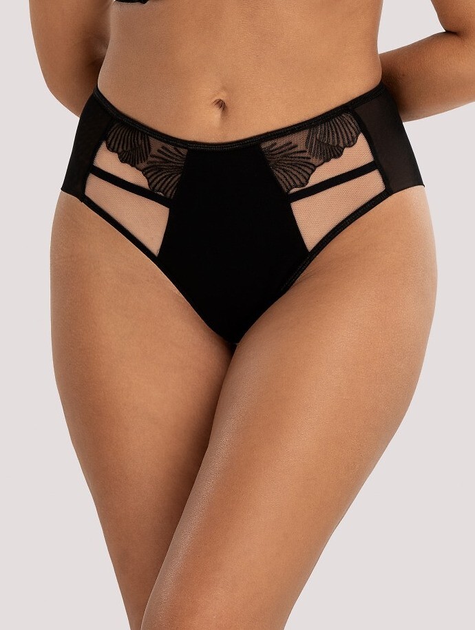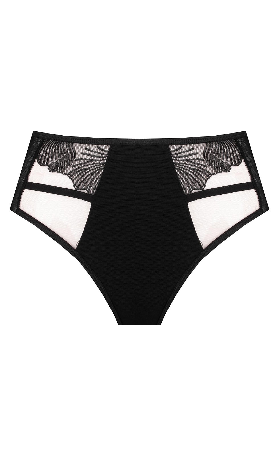 Dámské slipy klasického střihu - z lesklého mikrovlákna, průhledná síťovina zdobená výšivkou - vysoké, vypracované boky - dvojitá síťovaná záda - plochá guma v pase Složení: 83% polyamid, 12% elastan, 5% bavlna