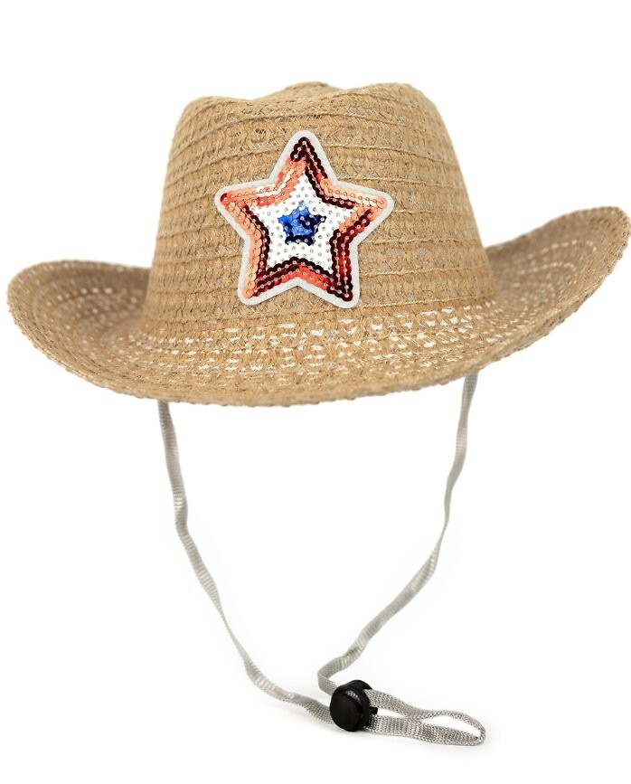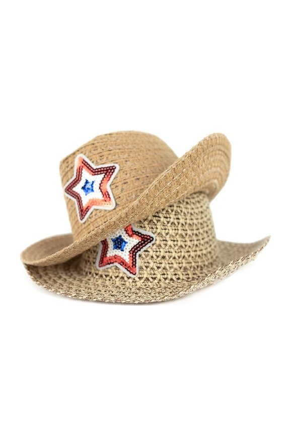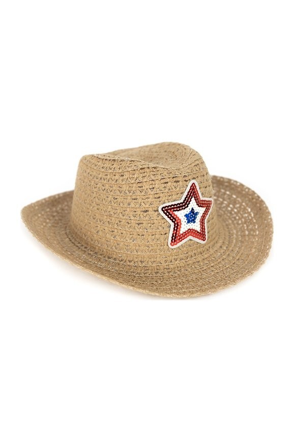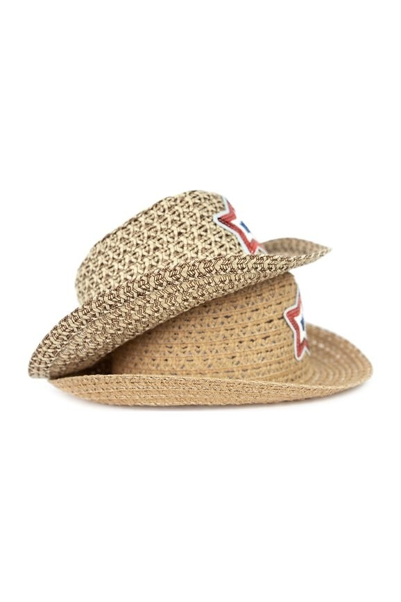 Kovbojský klobouk pro chlapce i dívku - zdobený nášivkou ve tvaru hvězdy - vyrobený z přírodních materiálů - syntetické dekorace s odolnými barvami - ideální na tematické večírky, výlety do zábavních parků, ale i na pláž a jako každodenní letní klobouk pro dítě - prolamovaný, extrémně lehký a velmi pohodlný - má gumičku, kterou lze nosit kolem krku nebo pod vlasy, která chrání před unášením mořským vánkem. Složení: 80% papír, 20% polyester