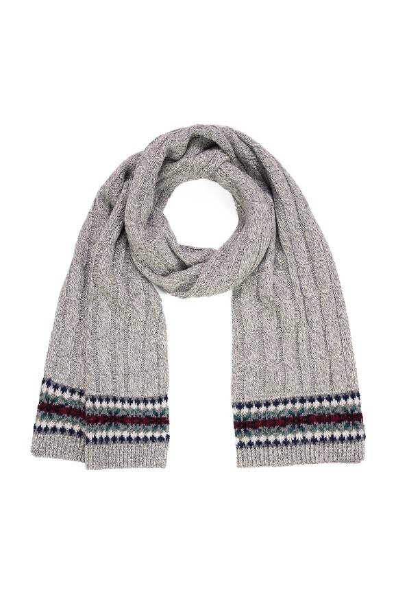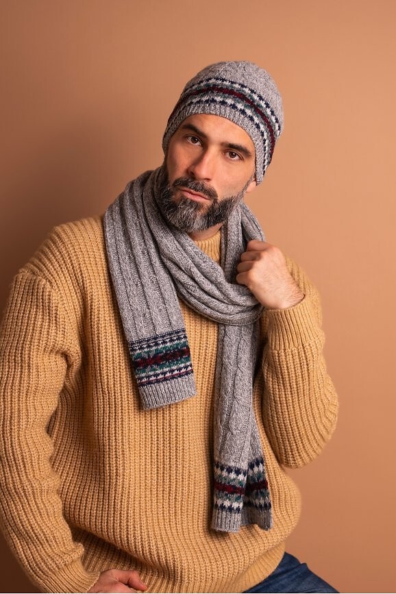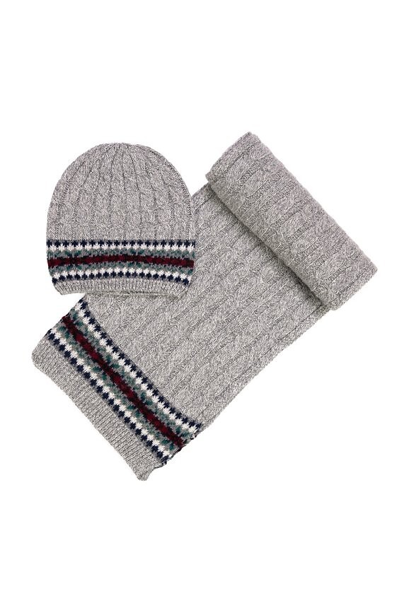 Univerzální zimní sada - čepice a šála - vyrobená z mírně pružného materiálu s přídavkem vlny - zdobená copánkovým výpletem a norským grafickým motivem. Složení: 70% akryl, 30% vlna