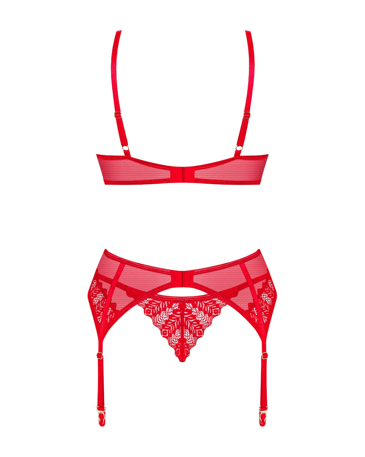 Smyslná, červená sada - obsahuje tanga, podprsenku a podvazkový pás - podprsenka s vícestupňovým zapínáním a nastavitelnými ramínky - lesklý přívěsek mezi košíčky - tanga, podvazkový pás a podprsenka jsou zdobeny svůdnou krajkou - elastický materiál zajišťuje pohodlí Složení: podprsenka a podvazkový pás: 94% polyamid, 6% elastan; tanga: 90% polyamid, 10% elastan