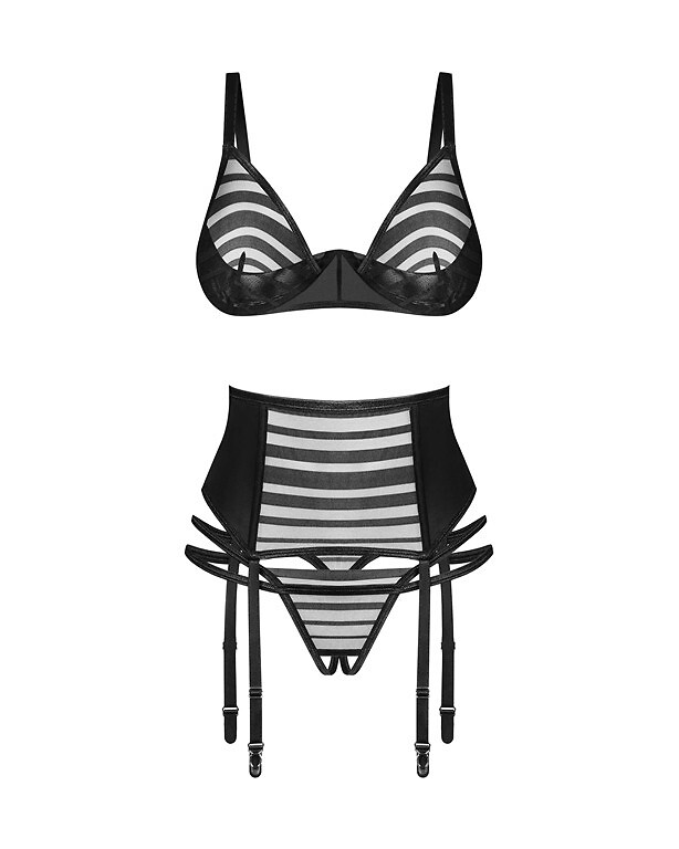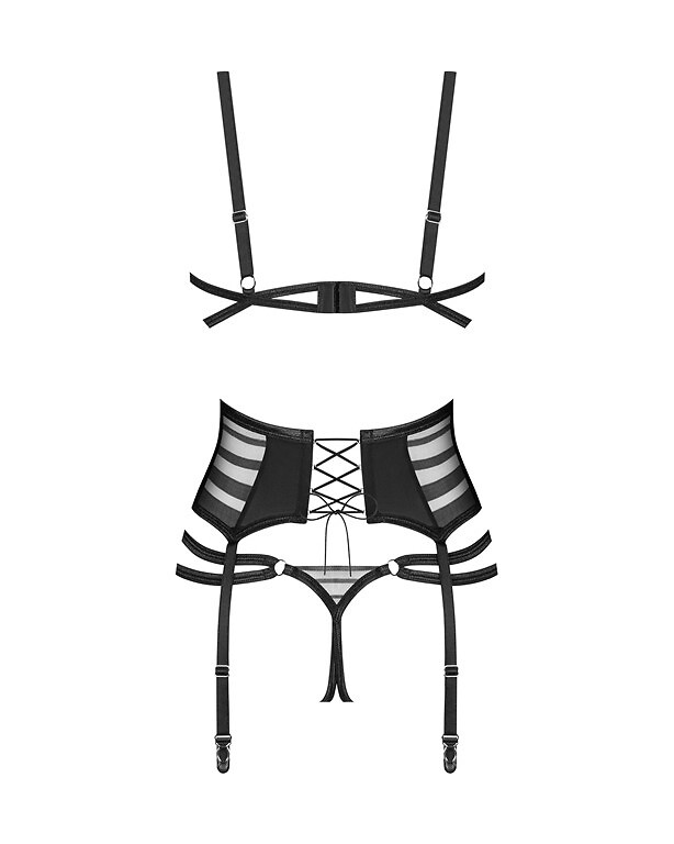 Trojdílná souprava Lune Bellis s černými ramínky v elegantním a módním designu - podprsenka, podvazkový pás a tanga s otevřeným střihem - spodní prádlo vyrobené z měkkých, vysoce kvalitních látek - podprsenka má dvoudílné košíčky s kosticemi - podvazkový pás je vybaven nastavitelnými ramínky a svislými kosticemi - tanga s otevřeným střihem jsou zdobena dvojitým lemem - souprava neobsahuje nikl Složení: 90% polyamid, 10% elastan