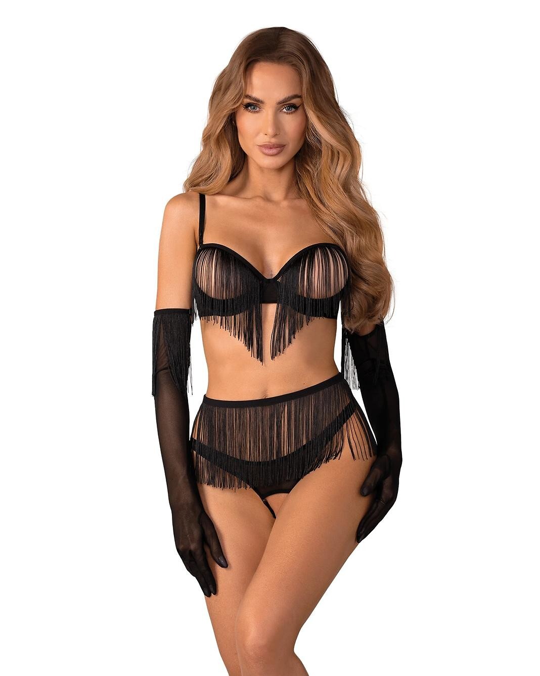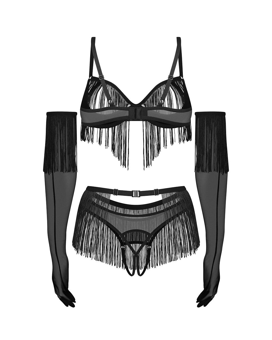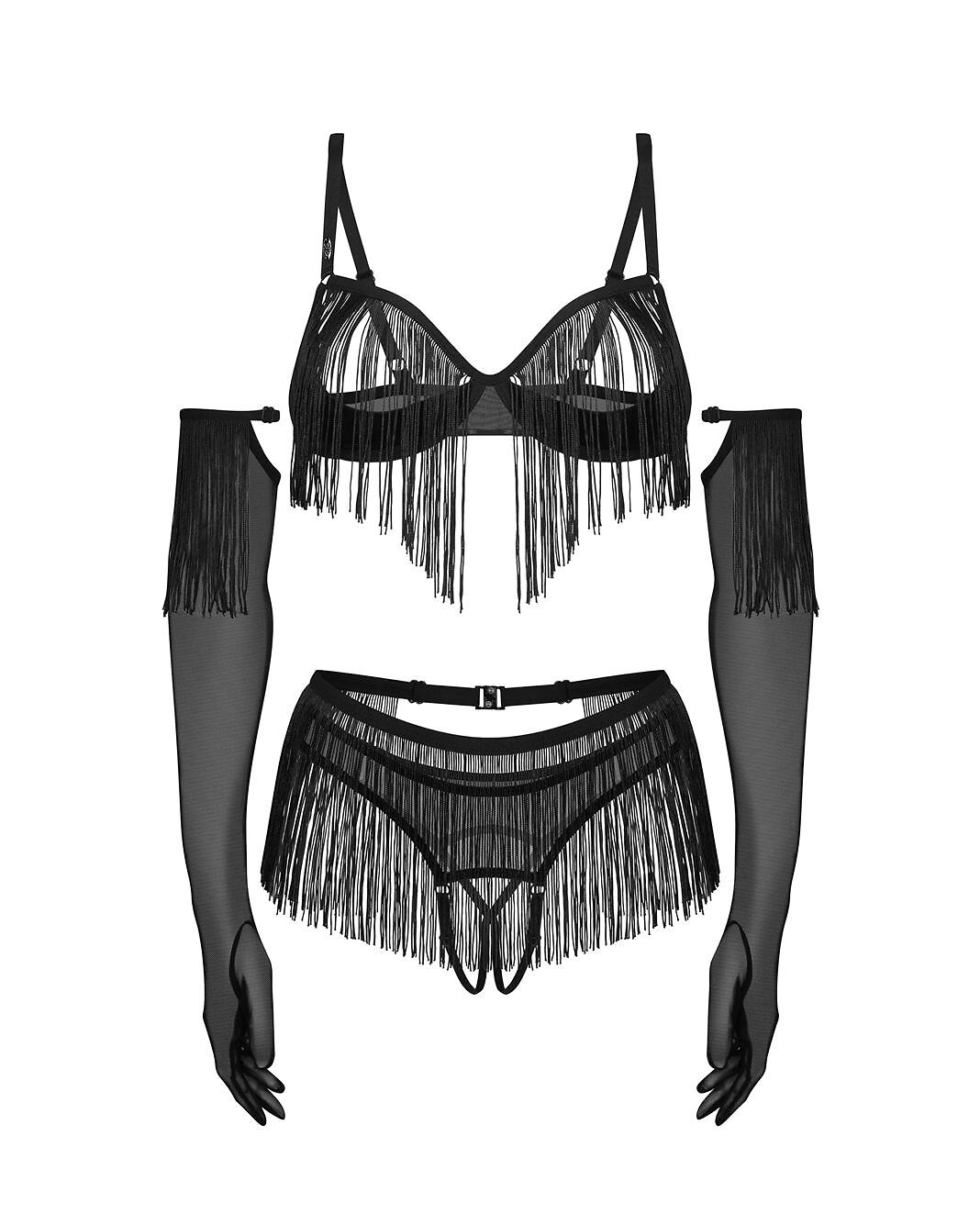 Smyslná dámská sada - podprsenka, tanga, pásek a dlouhé rukavice - vše zakončeno ozdobnými třásněmi - vyztužené košíčky s kosticemi - otevřená tanga bez rozkroku - ozdobný pásek smyslné, dlouhé rukavice Složení: podprsenka, rukavice: materiál 1 - 94% polyamid, 6% elastan; materiál 2 - 100% polyester tanga: 94% polyamid, 6% elastan pásek: materiál 1 - 72% polyamid, 28% elastan; materiál 2 - 100% polyester