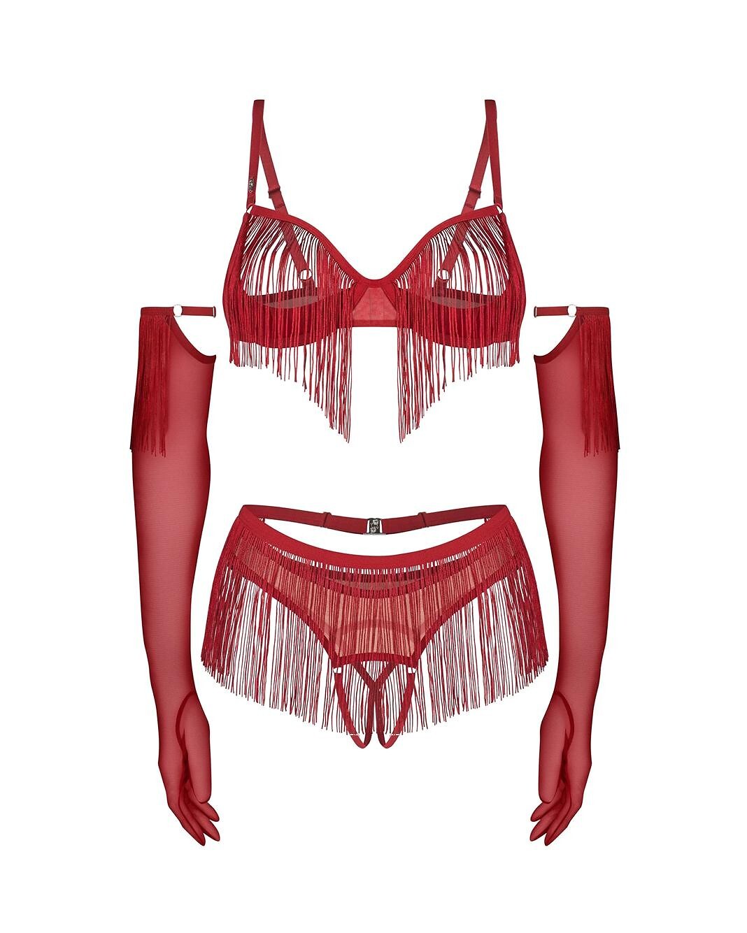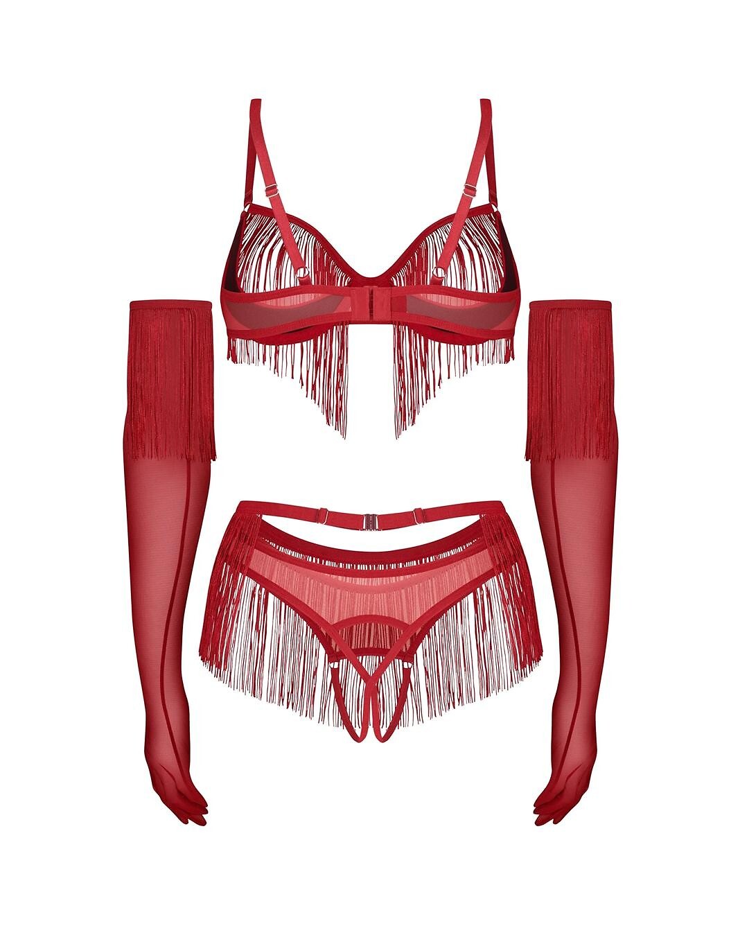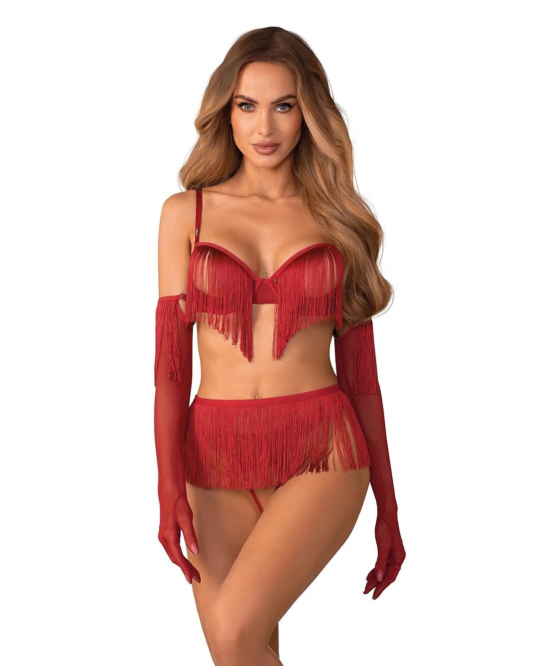 Smyslná dámská sada - podprsenka, tanga, pásek a dlouhé rukavice - vše zakončeno ozdobnými třásněmi - vyztužené košíčky s kosticemi - otevřená tanga bez rozkroku - ozdobný pásek smyslné, dlouhé rukavice Složení: podprsenka, rukavice: materiál 1 - 94% polyamid, 6% elastan; materiál 2 - 100% polyester tanga: 94% polyamid, 6% elastan pásek: materiál 1 - 72% polyamid, 28% elastan; materiál 2 - 100% polyester