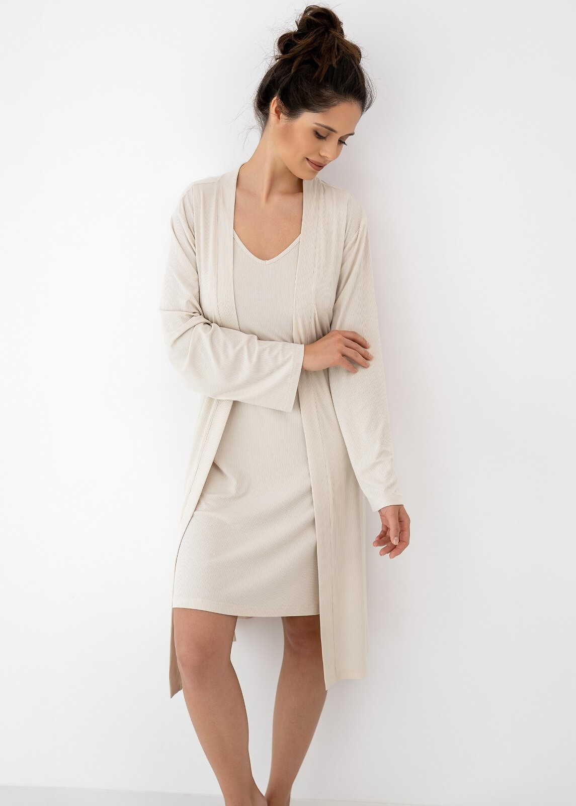 Dámský set, košile + župan - kvalitní viskóza s jemným proužkem - košile se širokými ramínky - výstřih a záda do tvaru V - délka nad kolena - župan s dlouhými rukávy - zavazování v pase - délka pod kolena - set balený v igelitovém sáčku Složení: 96% viskóza, 4% spandex