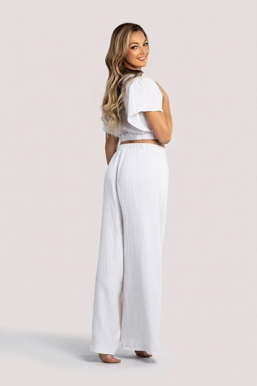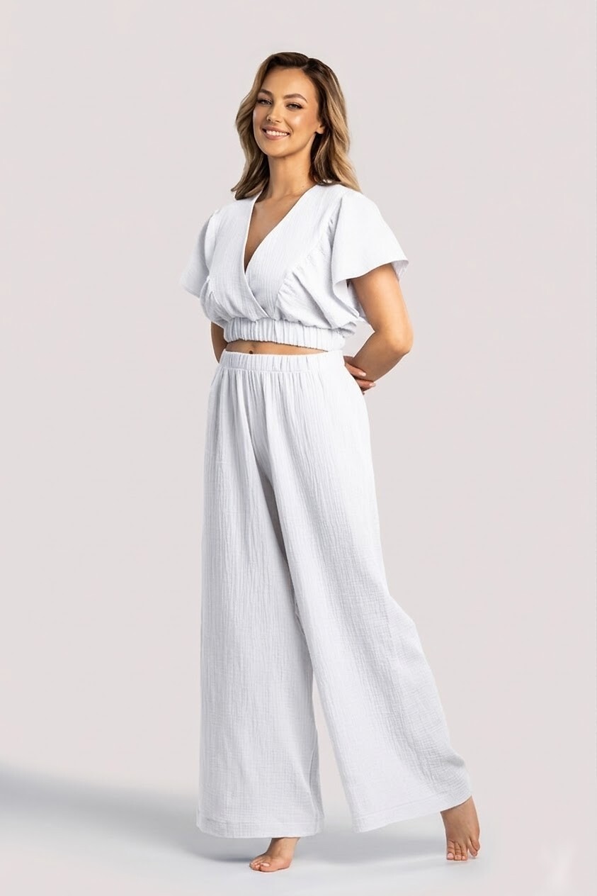 Dámská domácí souprava - vyrobena z přírodní mušelínové látky - krátká halenka s širokými rukávy - výstřih do V - přiléhavý spodní díl se stahovací šňůrkou - sladěné široké, dlouhé kalhoty. Složení: 100% bavlna