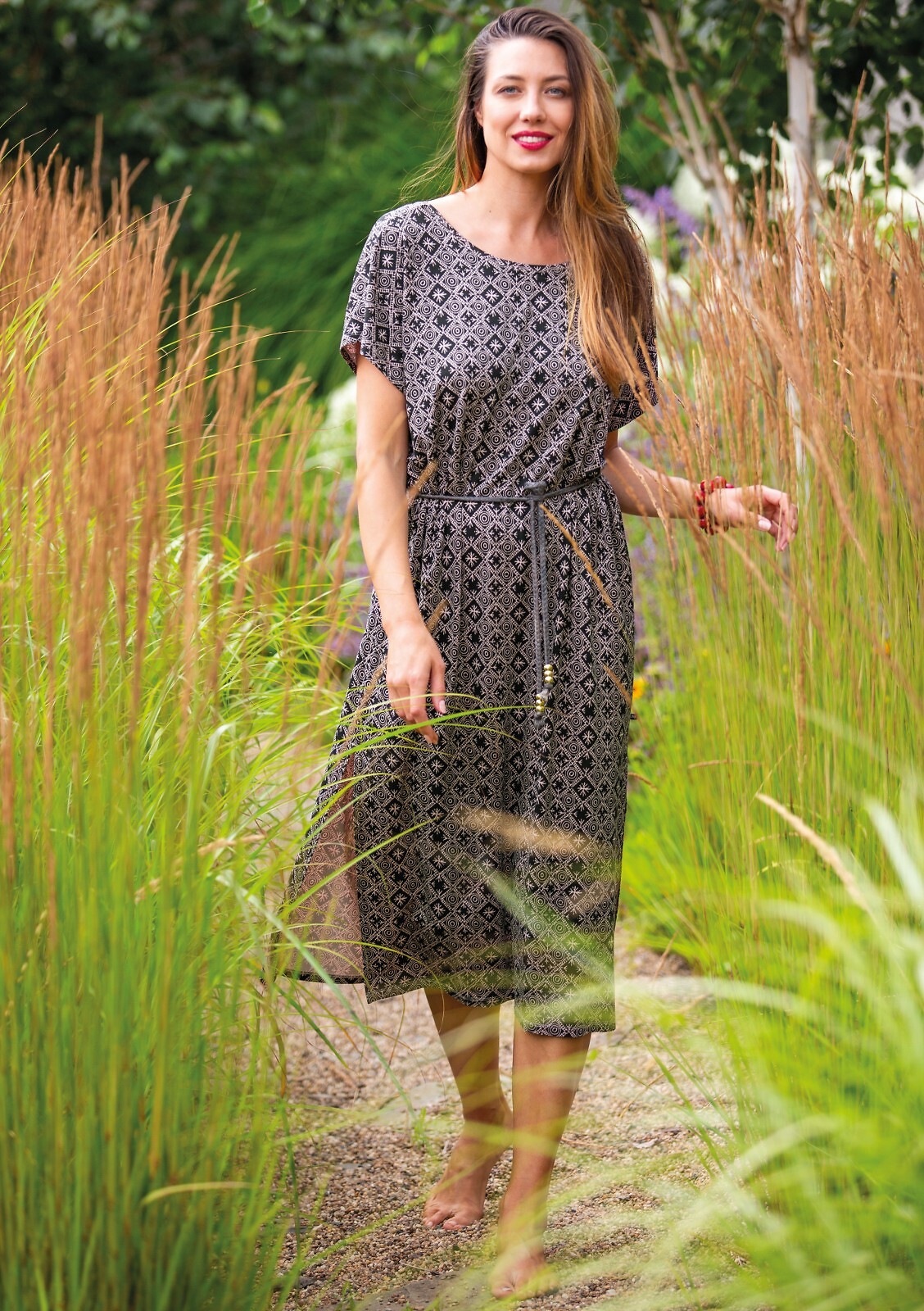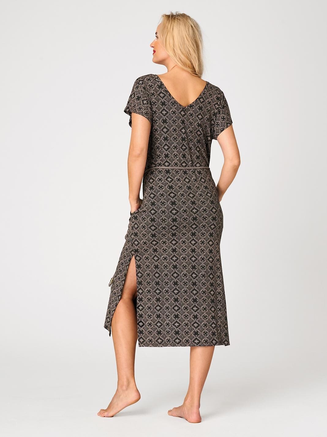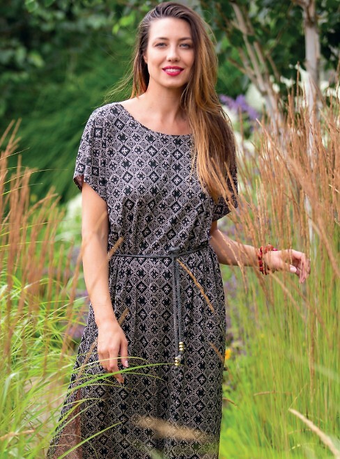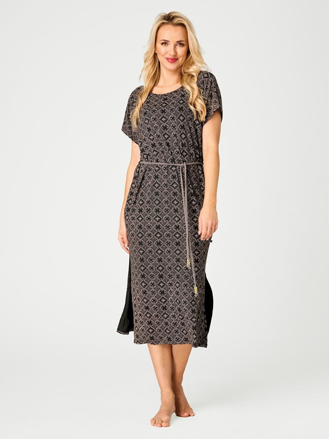 Dámské letní šaty - jemná viskóza - geometrický potisk - krátké rukávy - kulatý výstřih - záda do V - v pase zavazování pletenou šňůrkou zakončenou zlatými korálky - poutavé rozparky ve spodní části - délka ke kolenům Složení: 95% viskóza, 5% elastan