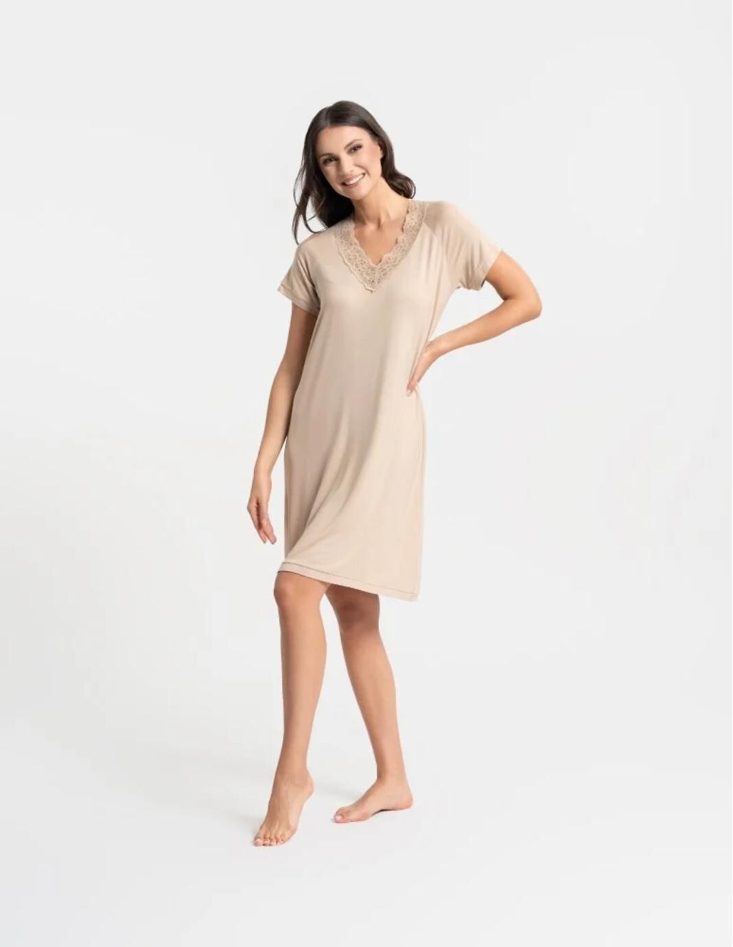 Dámská noční košilka - kvalitní bambusová viskóza - výstřih do "V", lemovaný krajkou - krátké rukávy - délka nad kolena - baleno v plastovém sáčku Složení: 90% bambusová viskóza, 10% elastan