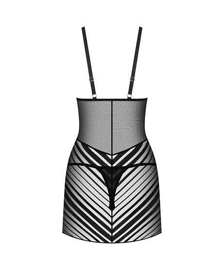 Krátká, přiléhavá noční košilka s tvarovaným střihem pod poprsím - klasická tanga součástí balení - spodní prádlo z vysoce kvalitní černé síťoviny - průhledná látka je částečně zdobena pruhy různé šířky - noční košilka má pohodlná, nastavitelná ramínka a decentní kovové detaily - odhalená záda - nastavitelná ramínka - přiléhavý střih. Složení: šaty (90% polyamid, 10% elastan); tanga (85% polyamid, 15% elastan)