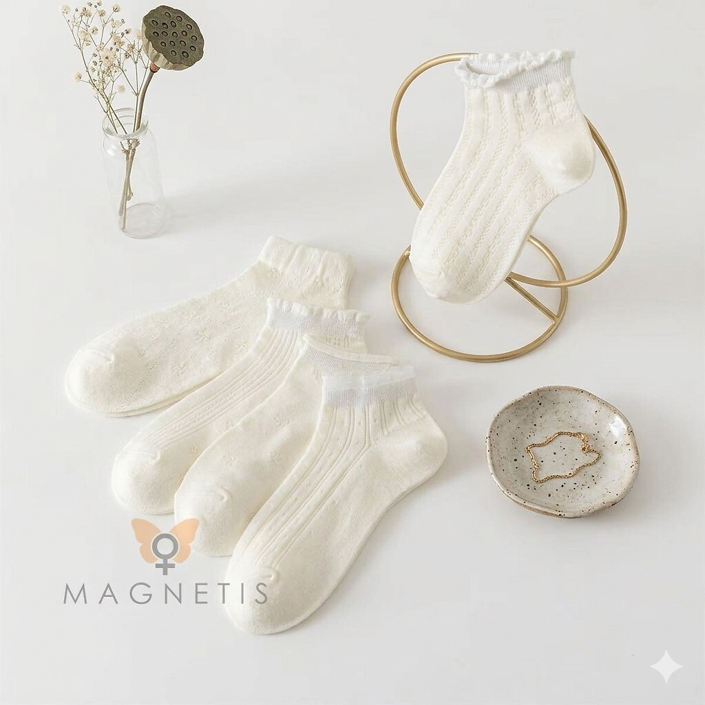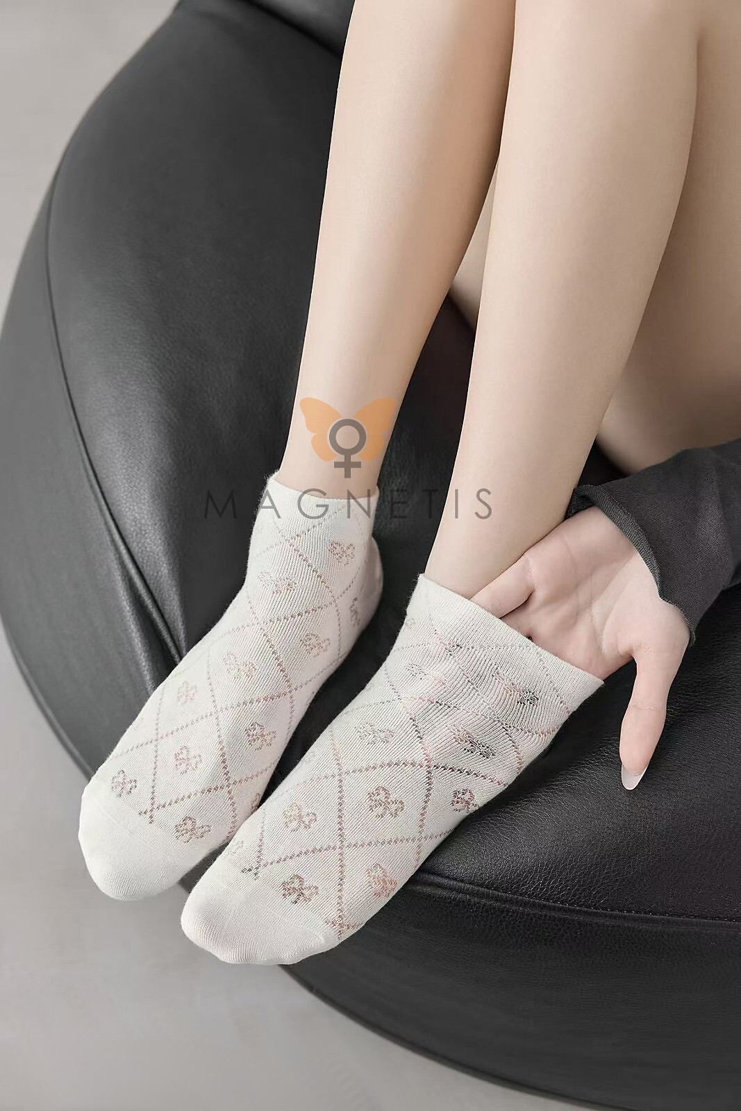 Dámské bavlněné ponožky - zdobené jemným vzorem - různé úpravy manžety v závislosti na vzoru - perfektně padnou na nohu - příjemné na dotek - dostupné v ecru barvě zdobené vzorem mašliček, proužků, teček, řetízků Složení: 75% bavlna, 15% polyamid, 5% polyester, 5% elastan