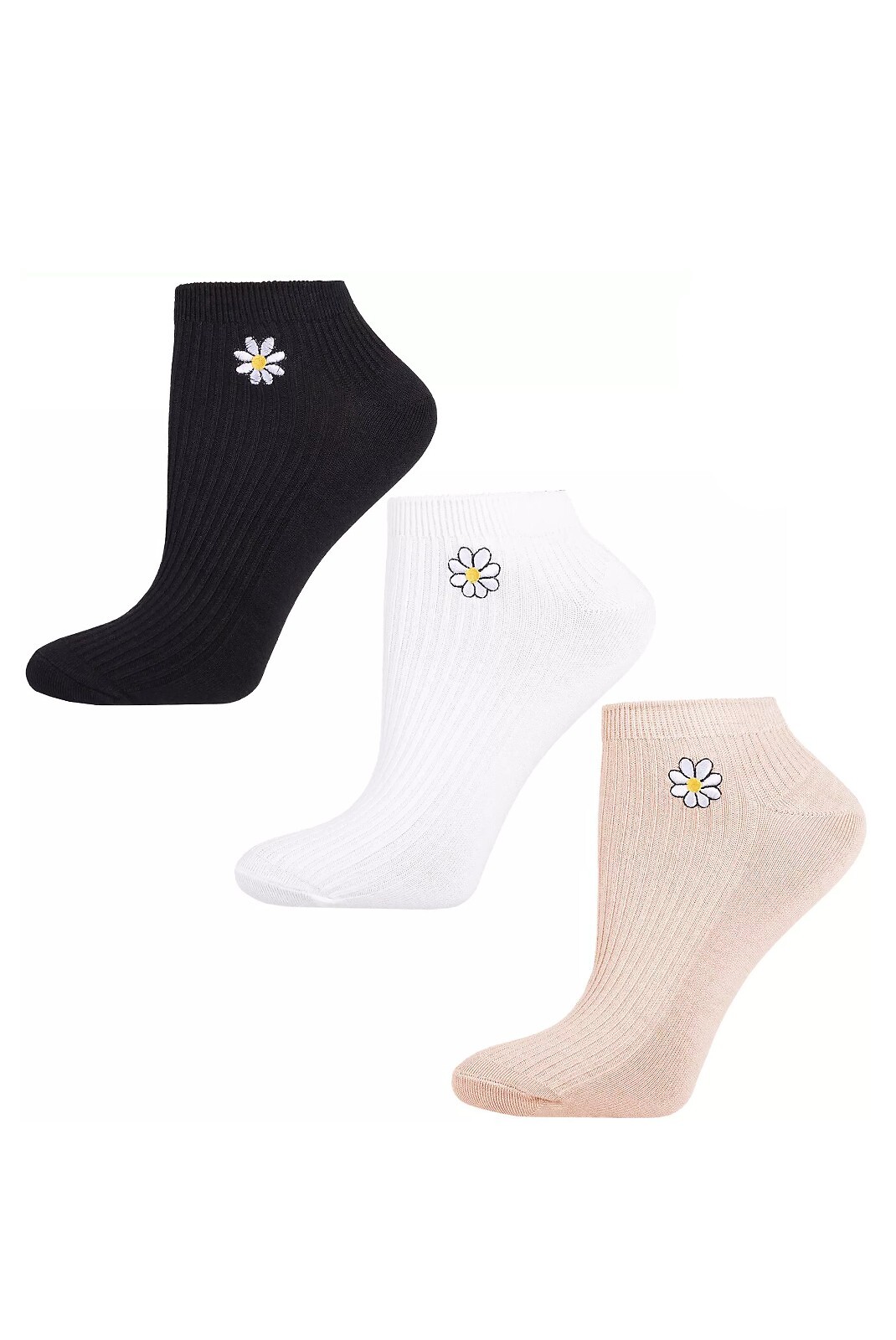 Dámské kotníkové ponožky - vyrobené z žebrované bavlny - zdobené jemnou květinovou výšivkou - perfektně padnou na nohu - velmi příjemné na dotek - dostupné barvy, náhodně vybrané: béžová, bílá, černá Složení: 40% bavlna, 40% viskóza, 15% polyamid, 5% elastan