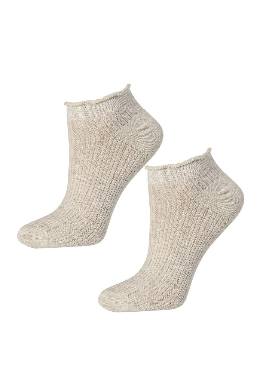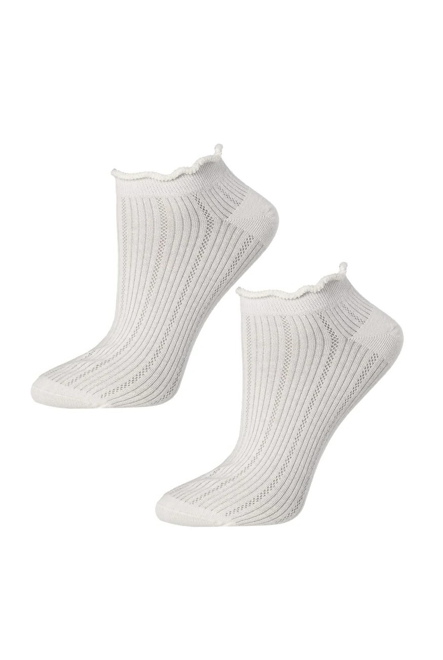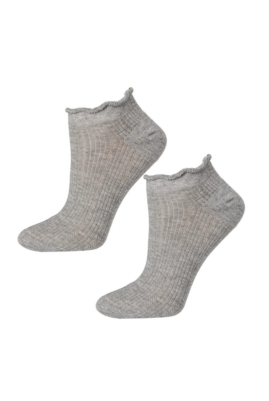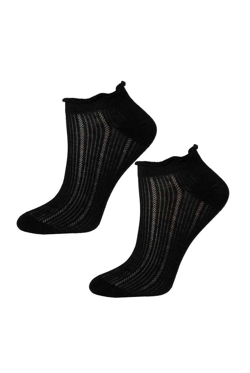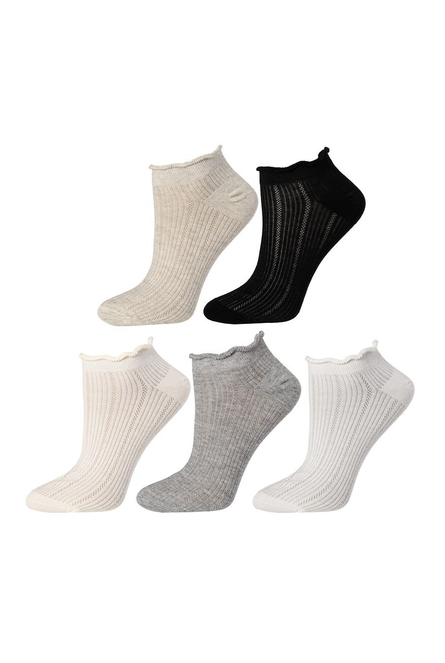 Dámské kotníkové ponožky - vyrobené z vysoce kvalitní žebrované bavlny - zdobené prolamovaným vzorem mezi pruhy - ideální pro každodenní styling - perfektně padnou na nohy a poskytují vysoký komfort nošení - manžeta zakončená volánkem - dostupné barvy, náhodně vybrané: černá, šedá melanž, béžová melanž, bílá, ecru Složení: 84% bavlna, 13% polyamid, 3% elastan