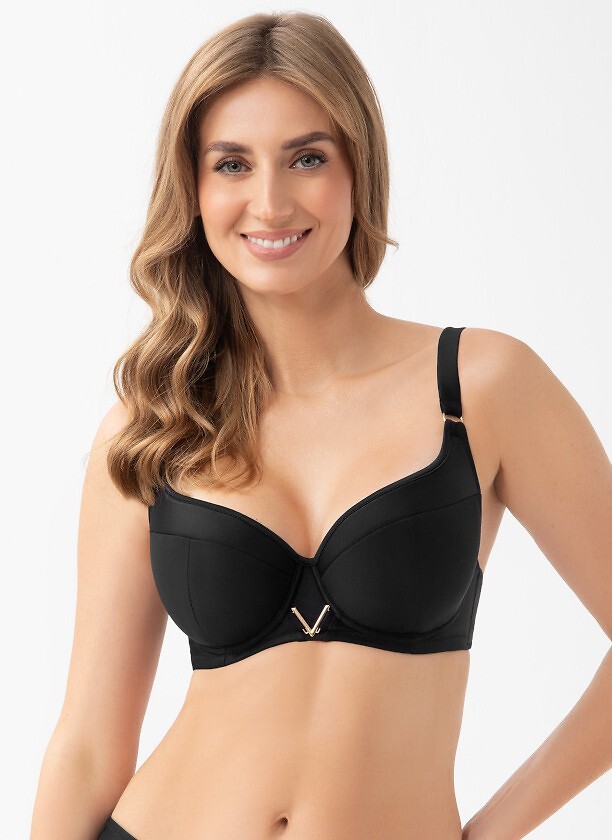 Dámská plavecká podprsenka - vyztužená, plná, s kosticemi - pokrývající celý prs - silnější, rychleschnoucí, prodyšná pěna, nemačká se - neodepínatelná, plně nastavitelná ramínka - svislé řezy zvedají a podpírají poprsí - spojení s kosticemi je zdobeno zlatým písmenem "V" - stabilní pás s boční elastickou kosticí - zapínání plastovou sponou Složení: 82% polyamid, 18% elastan