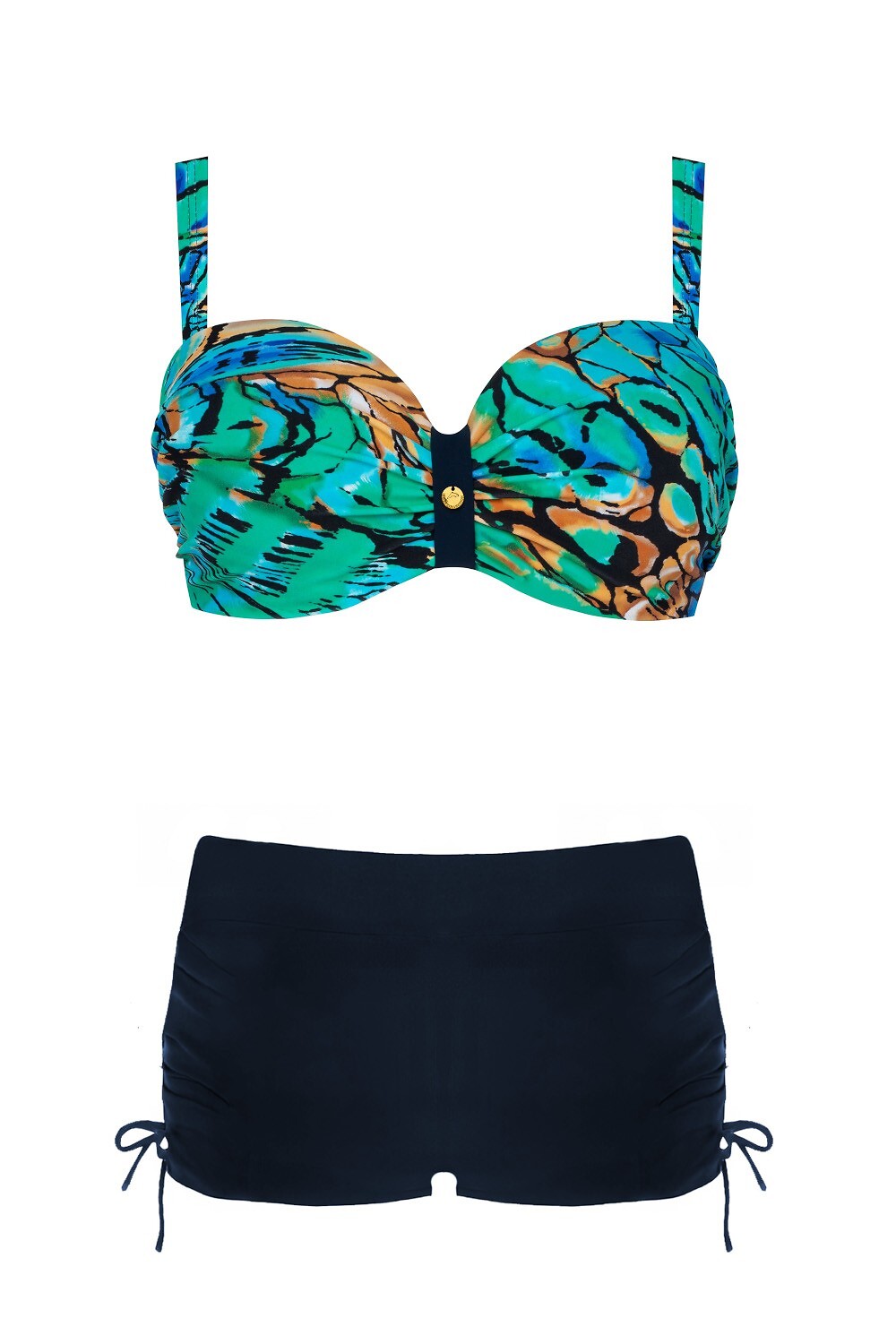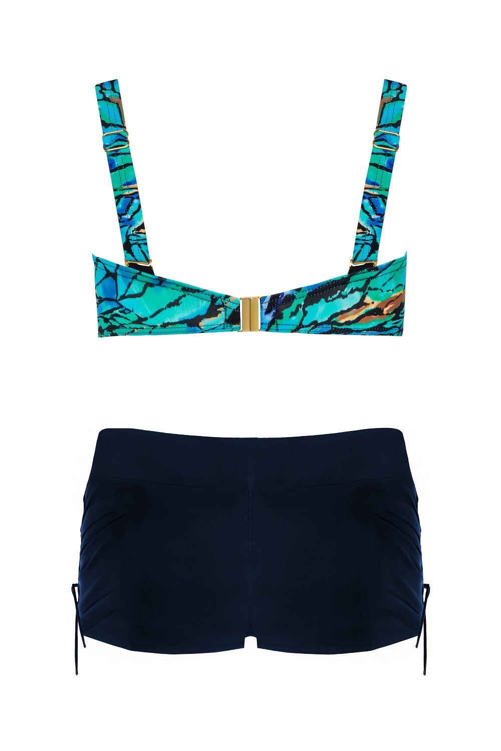 Dvoudílné plavky - podprsenka balconette - plné, s kosticemi, vyztužené košíčky - odnímatelná, širší ramínka - hlubší košíček - zapínání kovovou sponou - kalhotky ve stylu kraťasů v jednobarevné barvě - stahovací šňůrky pro nastavení délky a šířky na bocích Složení: 85% polyamid, 15% elastan