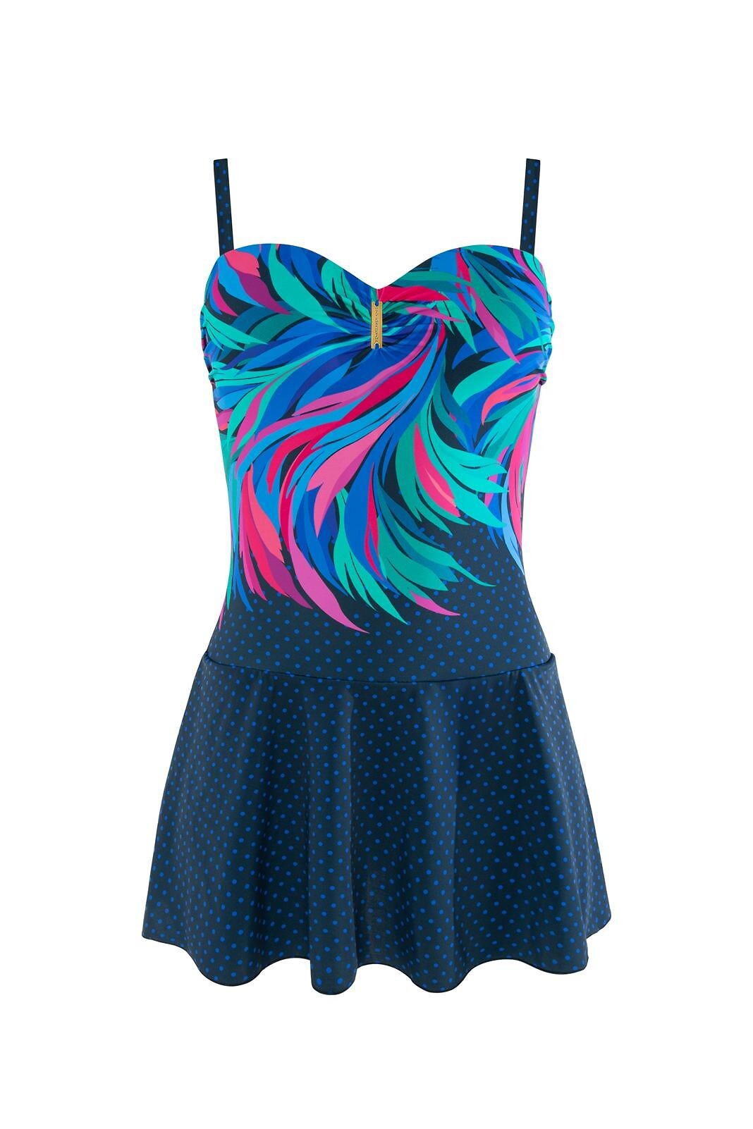 Jednodílné plavky - kombinace jednodílných plavek a sukně - mikrovlákno odolné vůči chloru - podpůrný košíček, bez kostic - nastavitelná, odnímatelná ramínka - model pro ženy, které si cení pohodlí a stylového vzhledu Složení: 85% polyamid, 15% elastan
