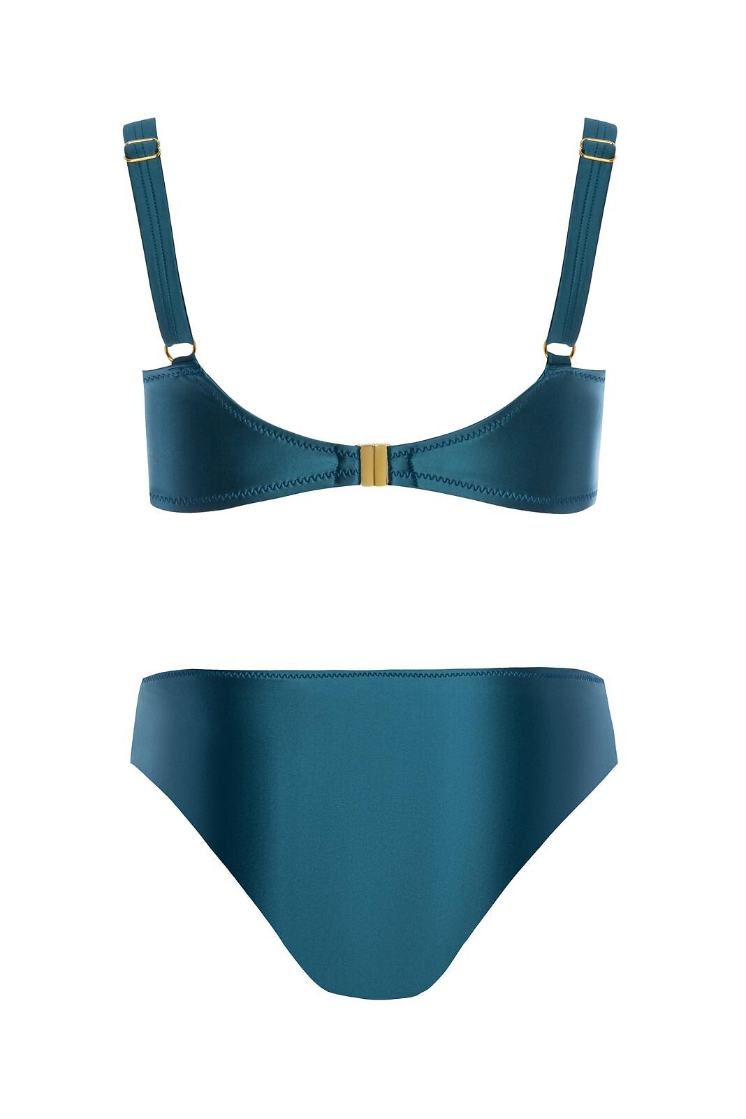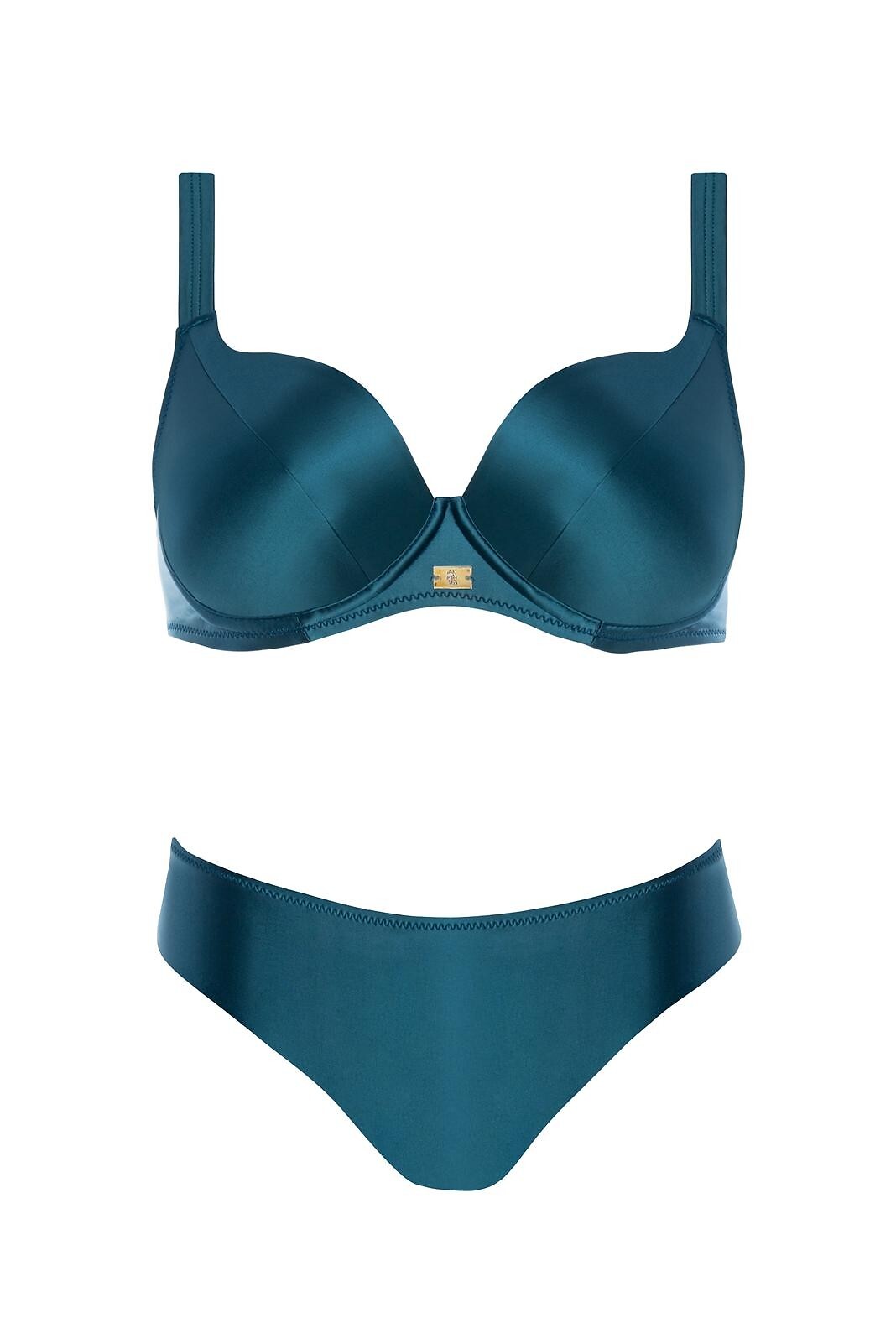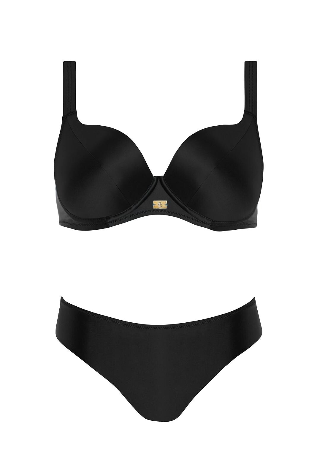 Dvoudílné plavky - plné měkké košíčky, s kosticemi - lesklý materiál - nastavitelná, neodnímatelná ramínka - zapínání na kovovou sponu - klasické kalhotky součástí balení. Složení: 85% polyamid, 15% elastan