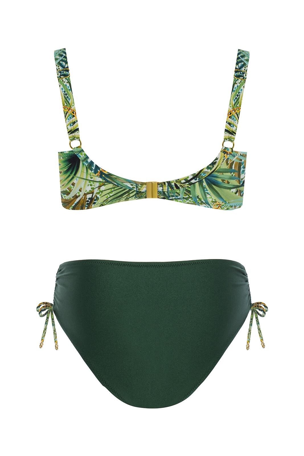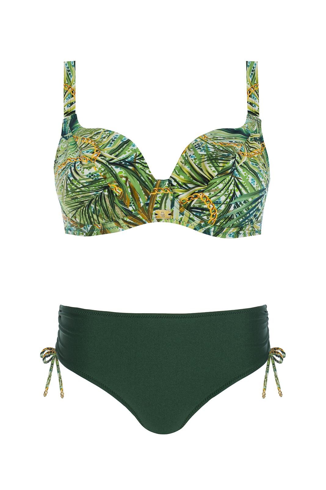 Dvoudílné plavky - plné košíčky s měkkými víčky a kosticemi, plné - podprsenka pro větší poprsí - nastavitelná, širší ramínka - zapínání vzadu - sladěné kalhotky midi střihu, jednobarevné - zavazování tkaniček na bocích pro nastavení šířky na boku Složení: 85% polyamid, 15% elastan