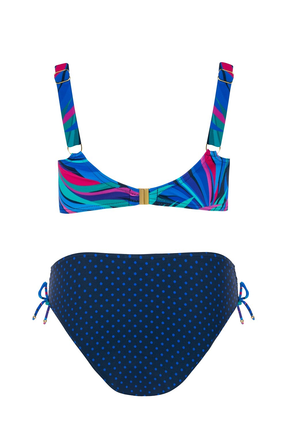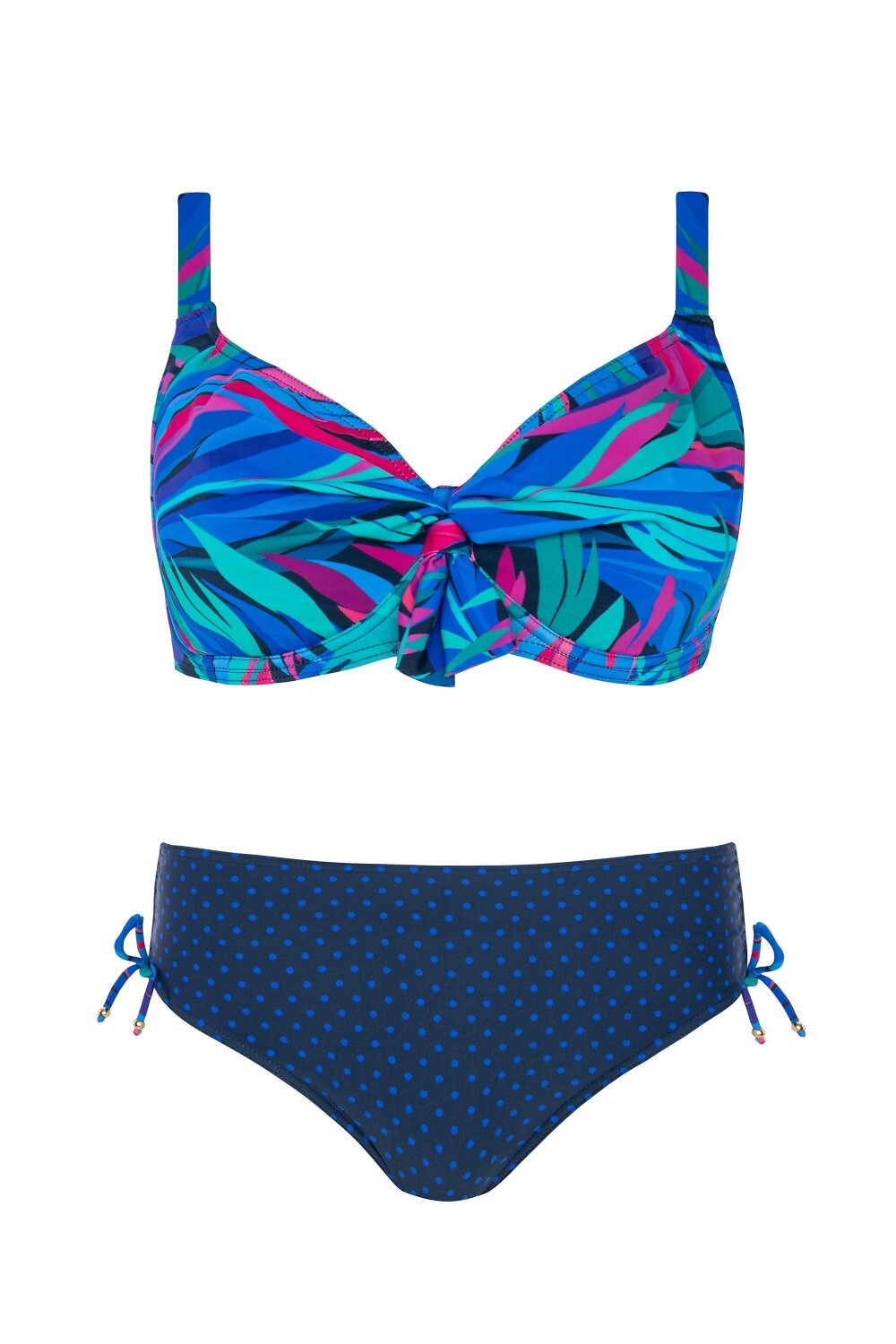 Dvoudílné plavky - s kosticemi, měkké košíčky s tenkou boční zpevňující pěnou - plné, pro větší poprsí - nastavitelná, neodnímatelná ramínka - zapínání na kovovou sponu - plné kalhotky se stahovacími šňůrkami po stranách Složení: 85% polyamid, 15% elastan