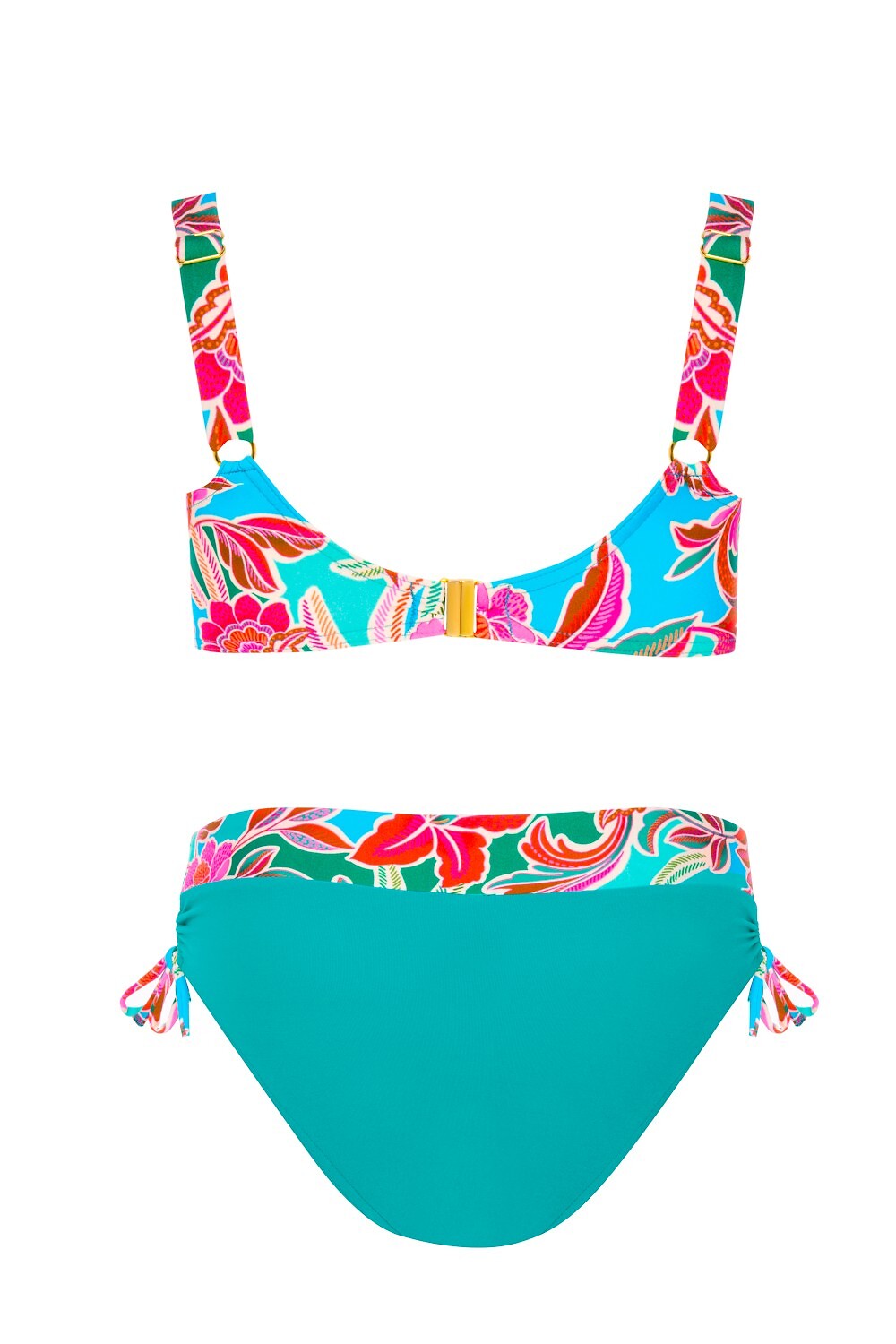 Dvoudílné plavky - s kosticemi, vyztužené košíčky - odnímatelné vycpávky ve velikostech 38C a 40C - nastavitelná ramínka, odnímatelná vzadu - zapínání na kovovou sponu - sada obsahuje kalhotky s širšími boky - stahovací šňůrky pro nastavení šněrování Složení: 85% polyamid, 15% elastan