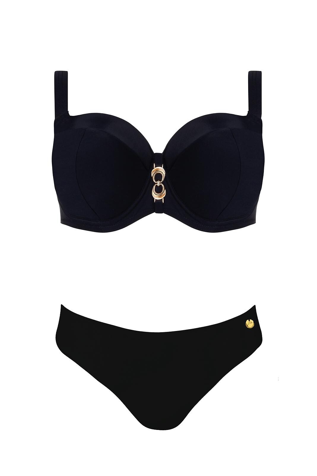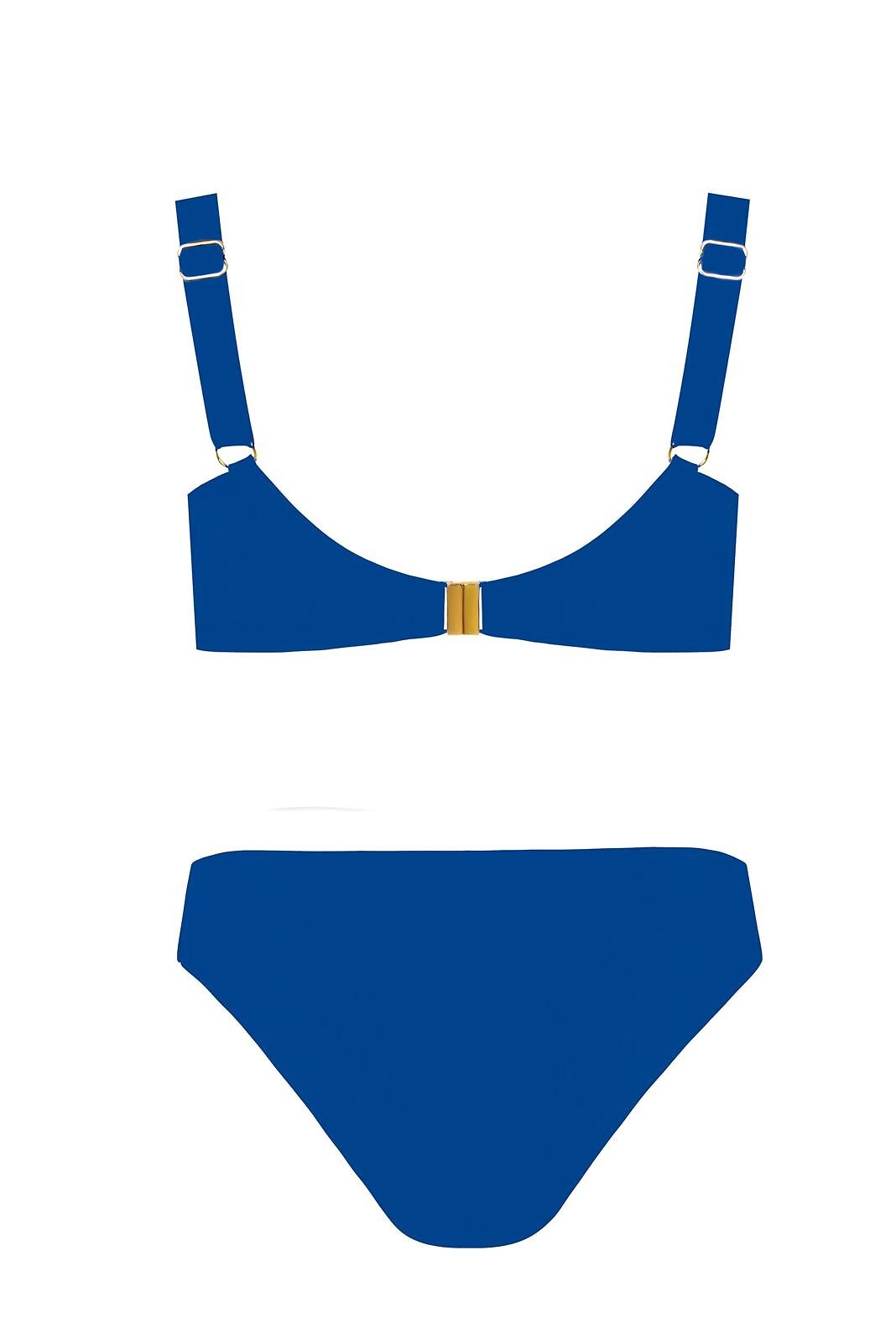 Dvoudílné plavky - plné košíčky, vyztužené, s kosticemi - odnímatelná vsadka - nastavitelná ramínka - zapínání na kovovou sponu - klasické kalhotky součástí balení. Složení: 85% polyamid, 15% elastan