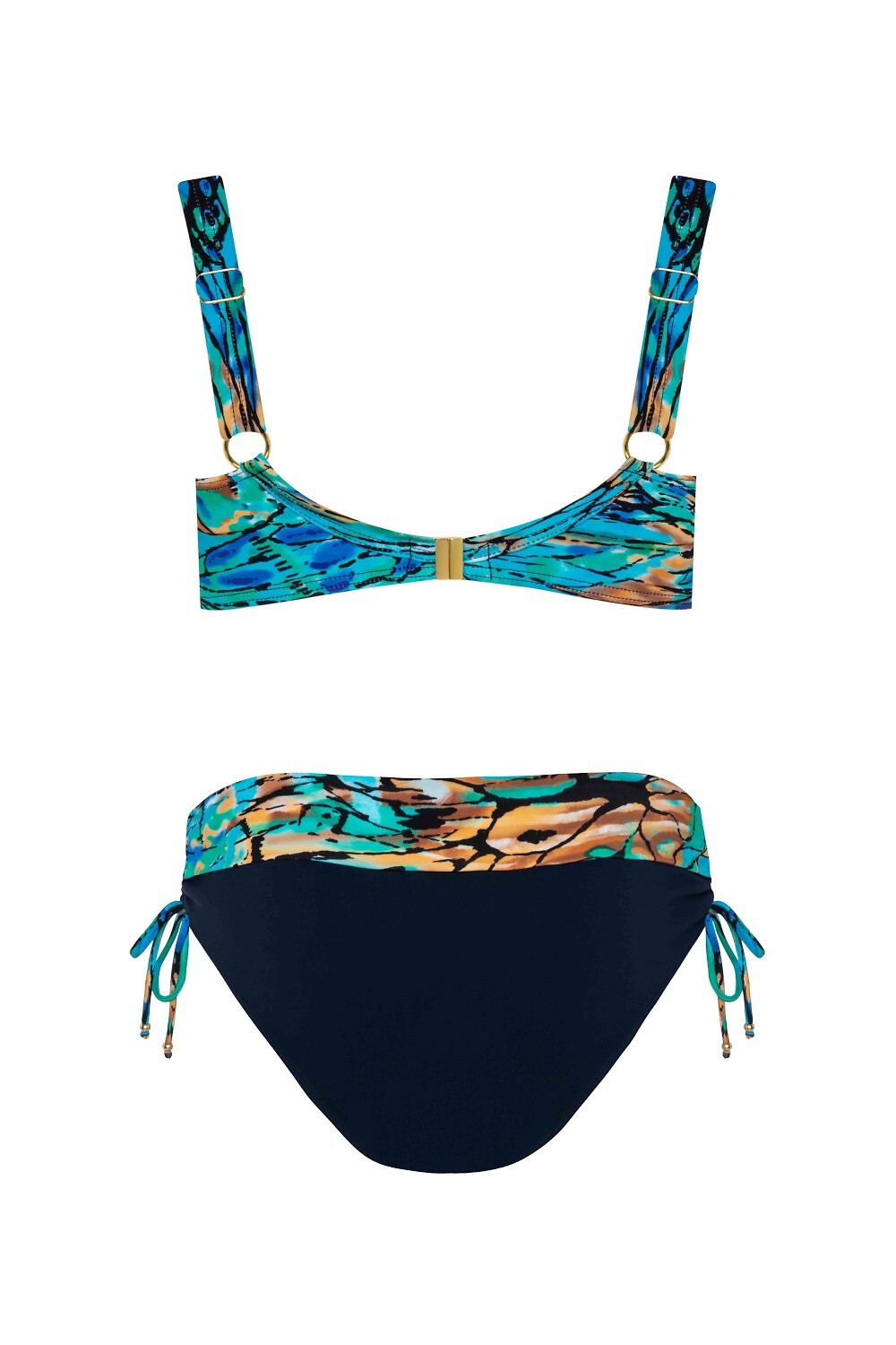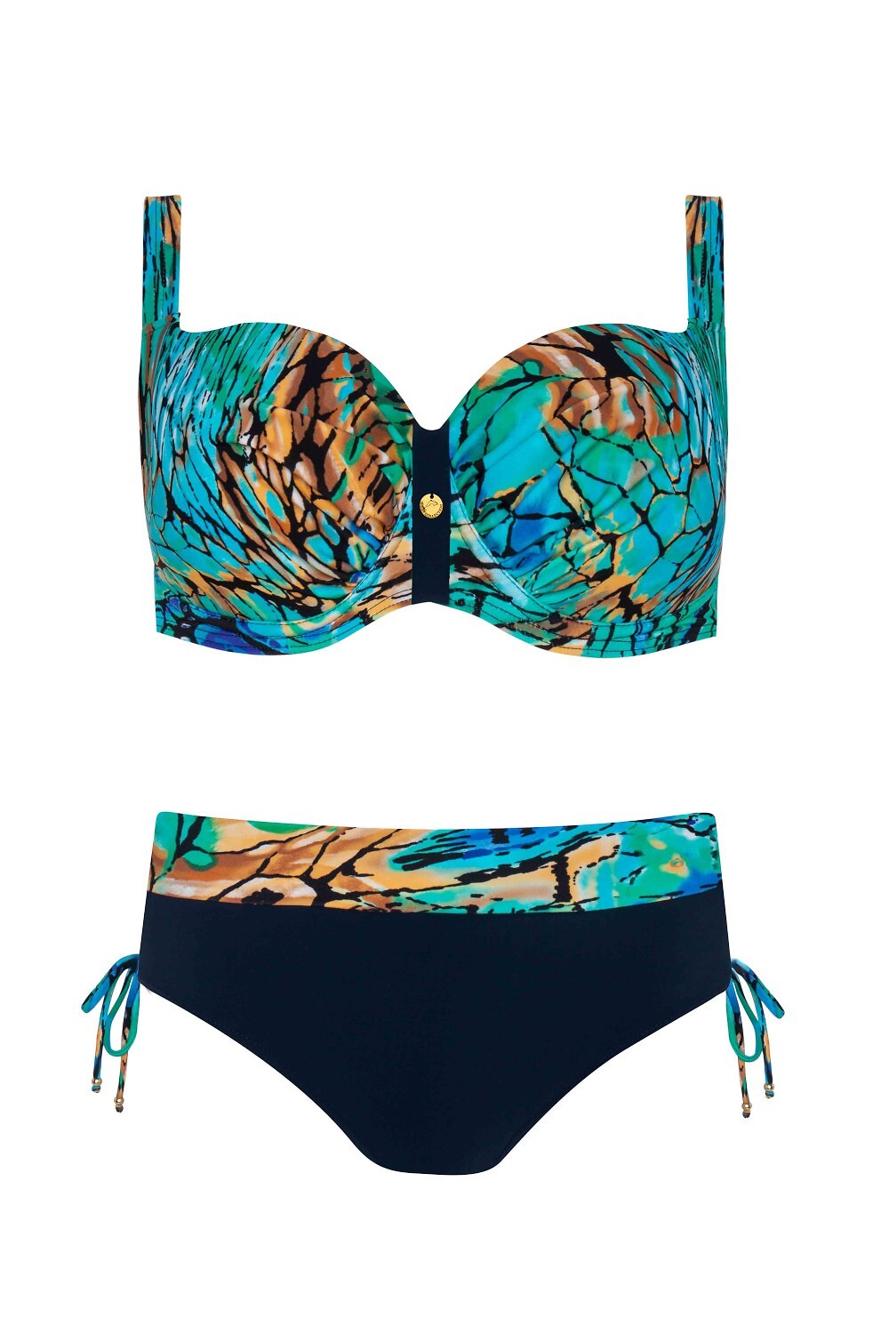 Dvoudílné plavky - s kosticemi, měkké košíčky, pro větší poprsí - nastavitelná, neodnímatelná ramínka - pásek zapínaný kovovou sponou - plné kalhotky se zavazováním, s ozdobným páskem Složení: 85% polyamid, 15% elastan