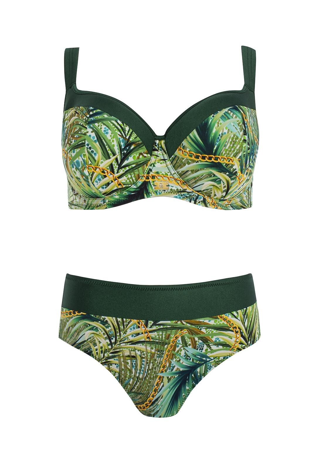 Dvoudílné plavky - vyztužené košíčky s kosticemi - podprsenka z barevného mikrovlákna s rostlinným potiskem - doporučeno pro velká prsa - nastavitelná, neodnímatelná ramínka - pásek zapínaný kovovou sponou - sladěné jednobarevné kalhotky s ozdobným ramínkem (skutečné kalhotky na foto č. 2) - plnější střih - podšité vrstvou látky - odolné vůči chloru Složení: 85% polyamid, 15% elastan