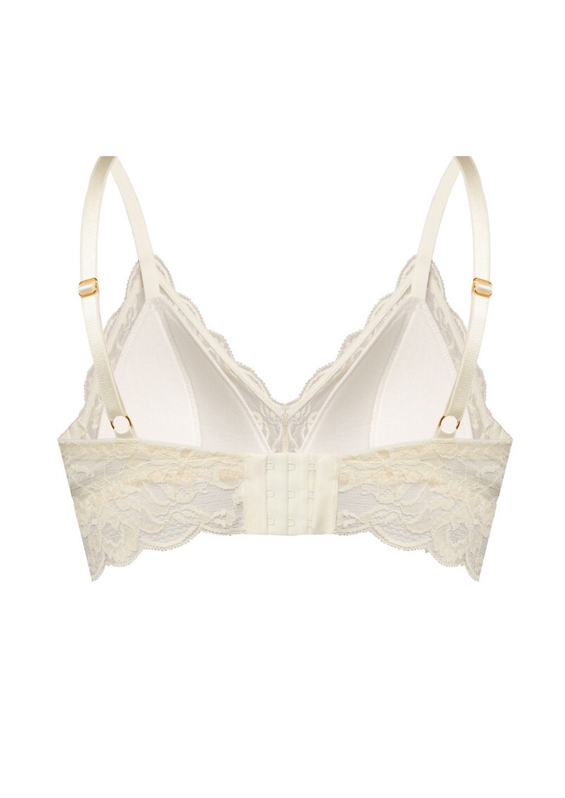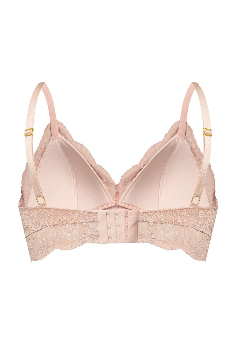 Podprsenka s prolamovanou krajkou - měkké košíčky, bez kostic, podšitá houbičkou - košíčky spojené saténovou mašlí a přívěskem - krajkové boky s kosticemi - třípoziční zapínání na tří háčky na zadní straně - neodepínatelná, nastavitelná ramínka Složení: 63% polyamid, 13% elastan, 24% bavlna