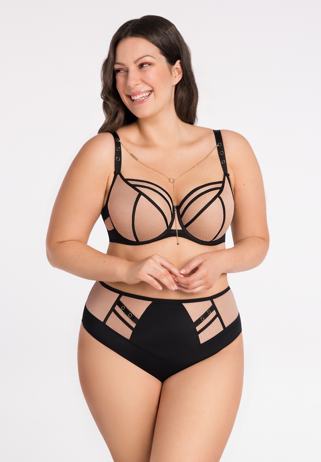 Měkká podprsenka - vyrobená z průhledného tylu - poskytuje velmi silné zvednutí a řasení poprsí - třídílné košíčky - švy překryté matnou saténovou páskou - odnímatelný ozdobný řetízek na výstřihu - záda zakončená širokou, měkkou, elastickou páskou - boční kostice proti srolování materiálu - v závislosti na velikosti dvouřadý nebo třířadý háček s třístupňovým nastavením obvodu - neodnímatelná, nastavitelná ramínka ve třech šířkách - světle zlaté kovové prvky - design K 564 Složení: 90% polyamid, 7% elastan, 3% polyester