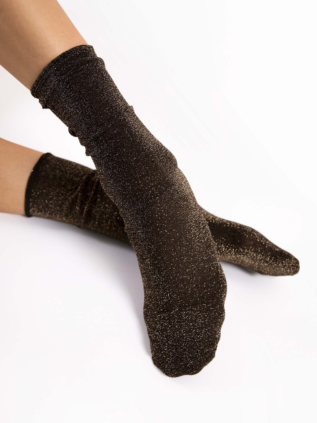 Ponožky 60 den - zdobené lesklou nití - nekompresní manžeta. Složení: 50% elastan, 50% metalizovaná příze.