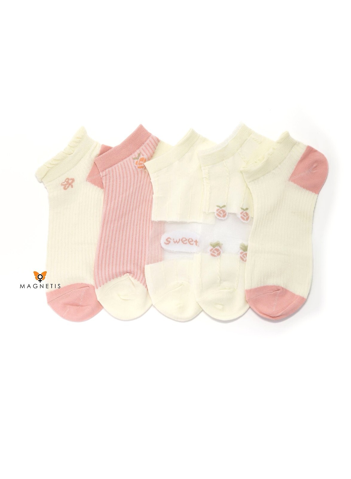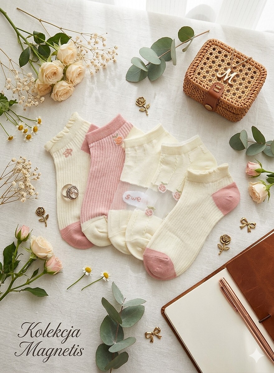 Dámské bavlněné ponožky - zdobené jemným vzorem - manžety s různou úpravou v závislosti na vzoru - perfektně padnou na nohu - příjemné na dotek - dostupné v ecru a růžové barvě, zdobené pruhovaným vzorem, květinami a nápisy. Složení: 64% bavlna, 36% polyester