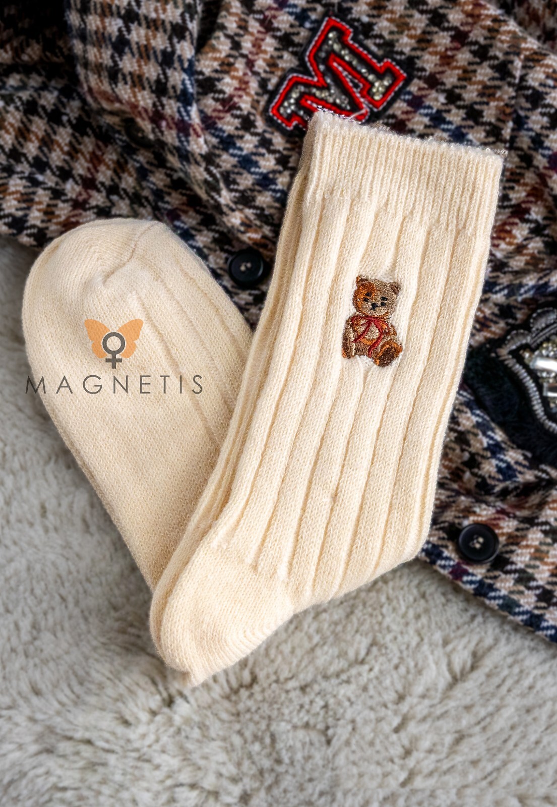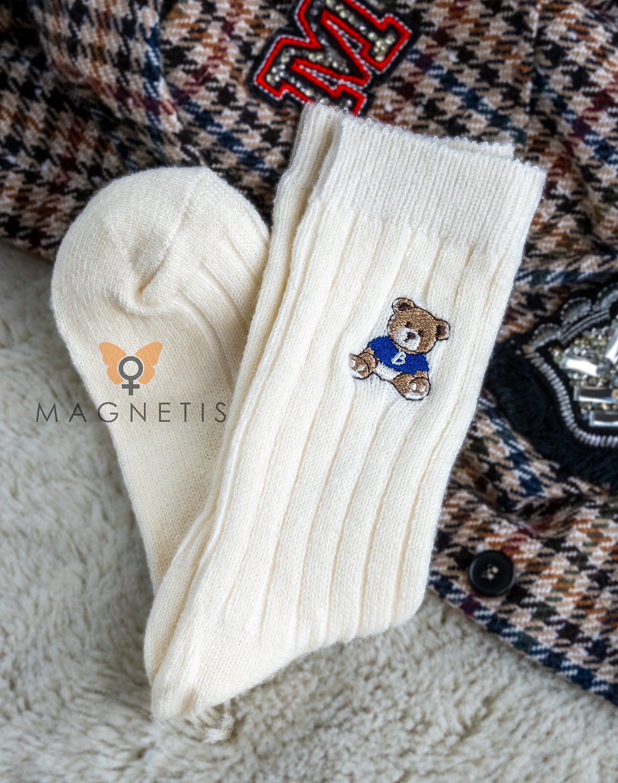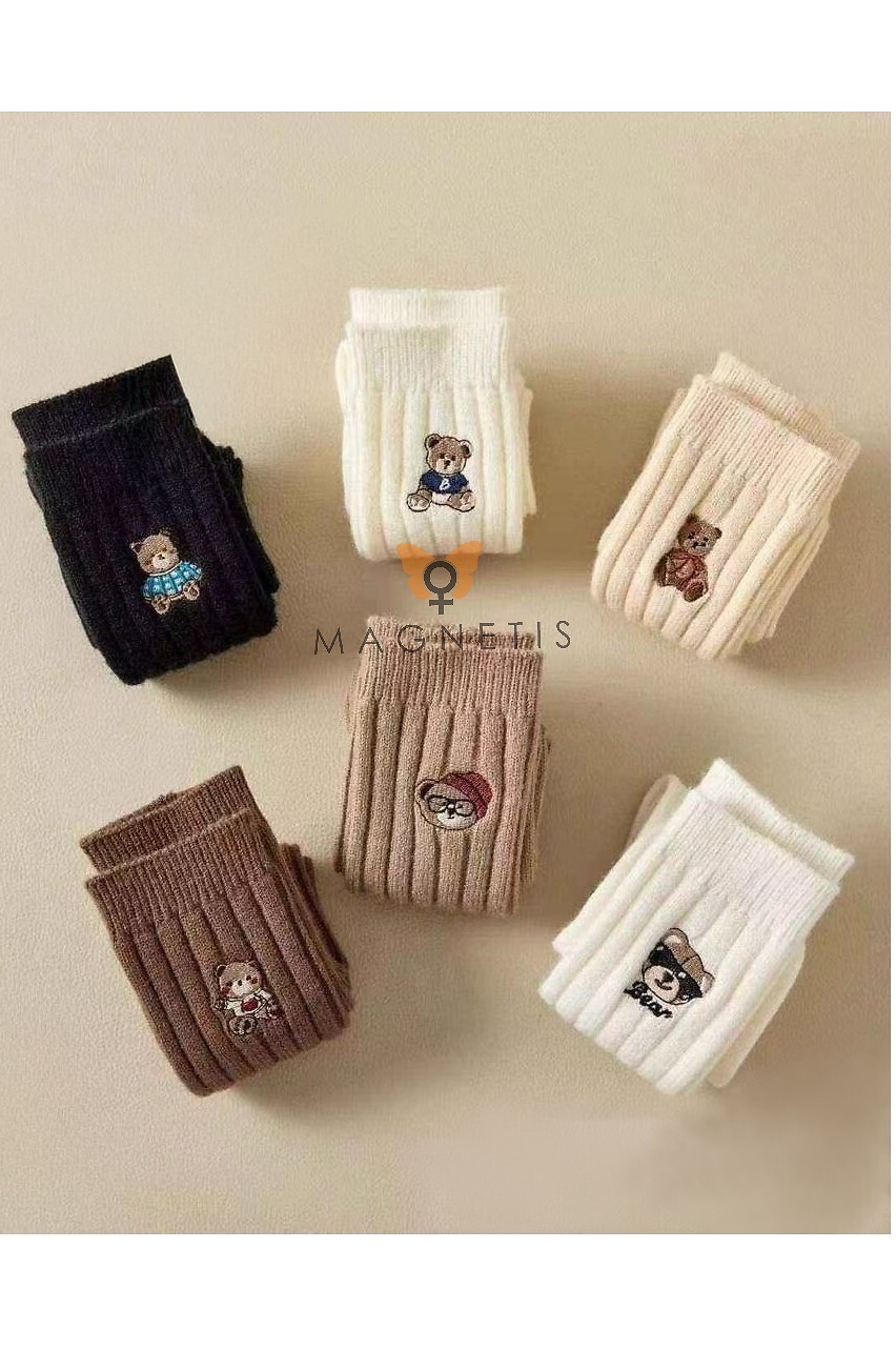 Teplé dámské ponožky - měkký žebrovaný úplet - svršek zdobený aplikací medvídka - nekompresní manžeta Složení: 65% bavlna, 13% viskóza, 13% vlna, 6% polyamid, 3% elastan