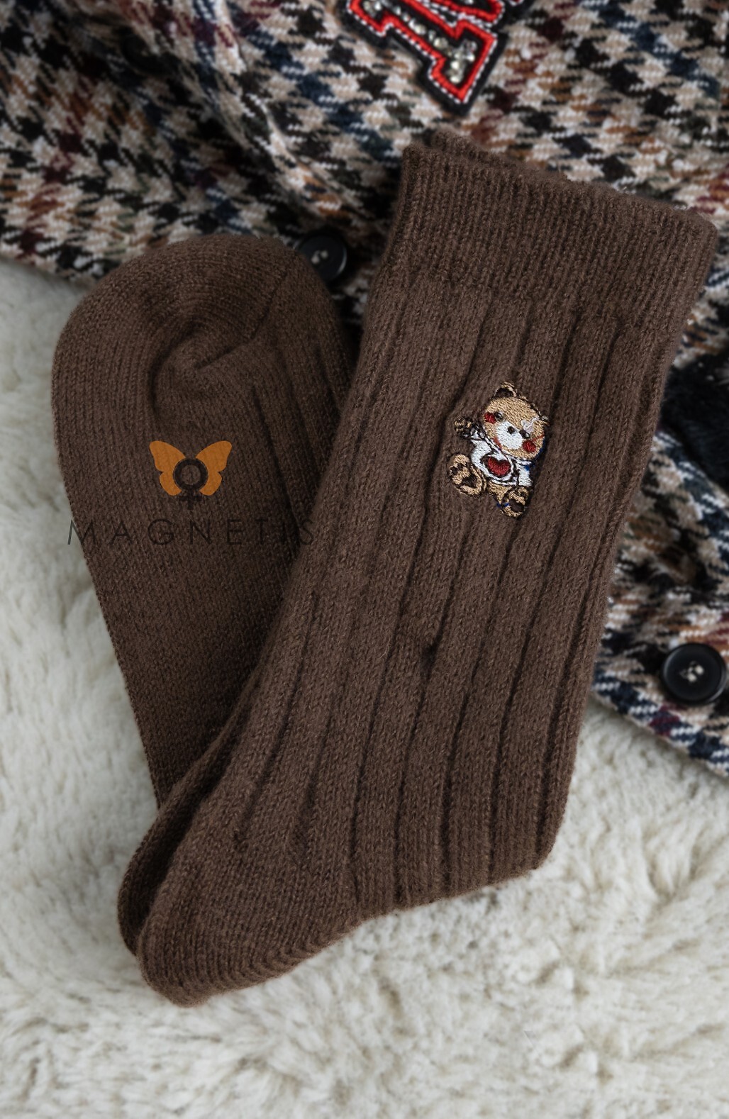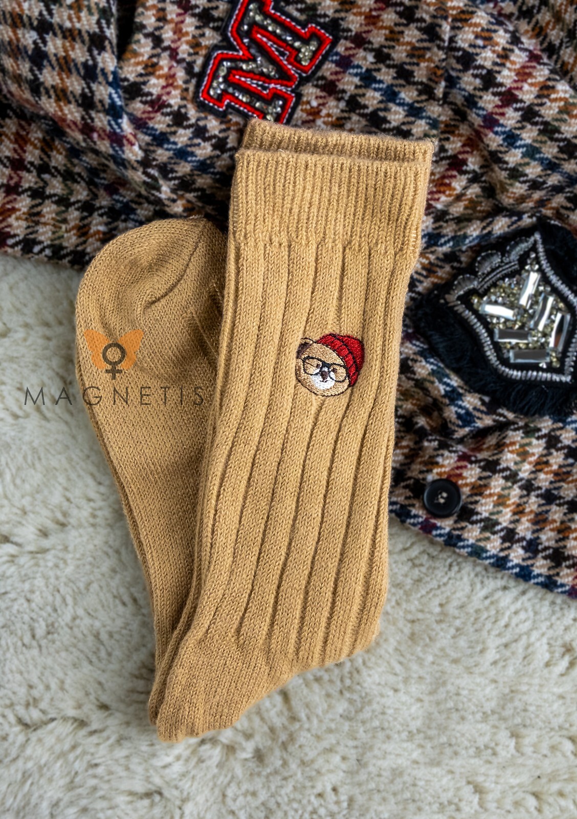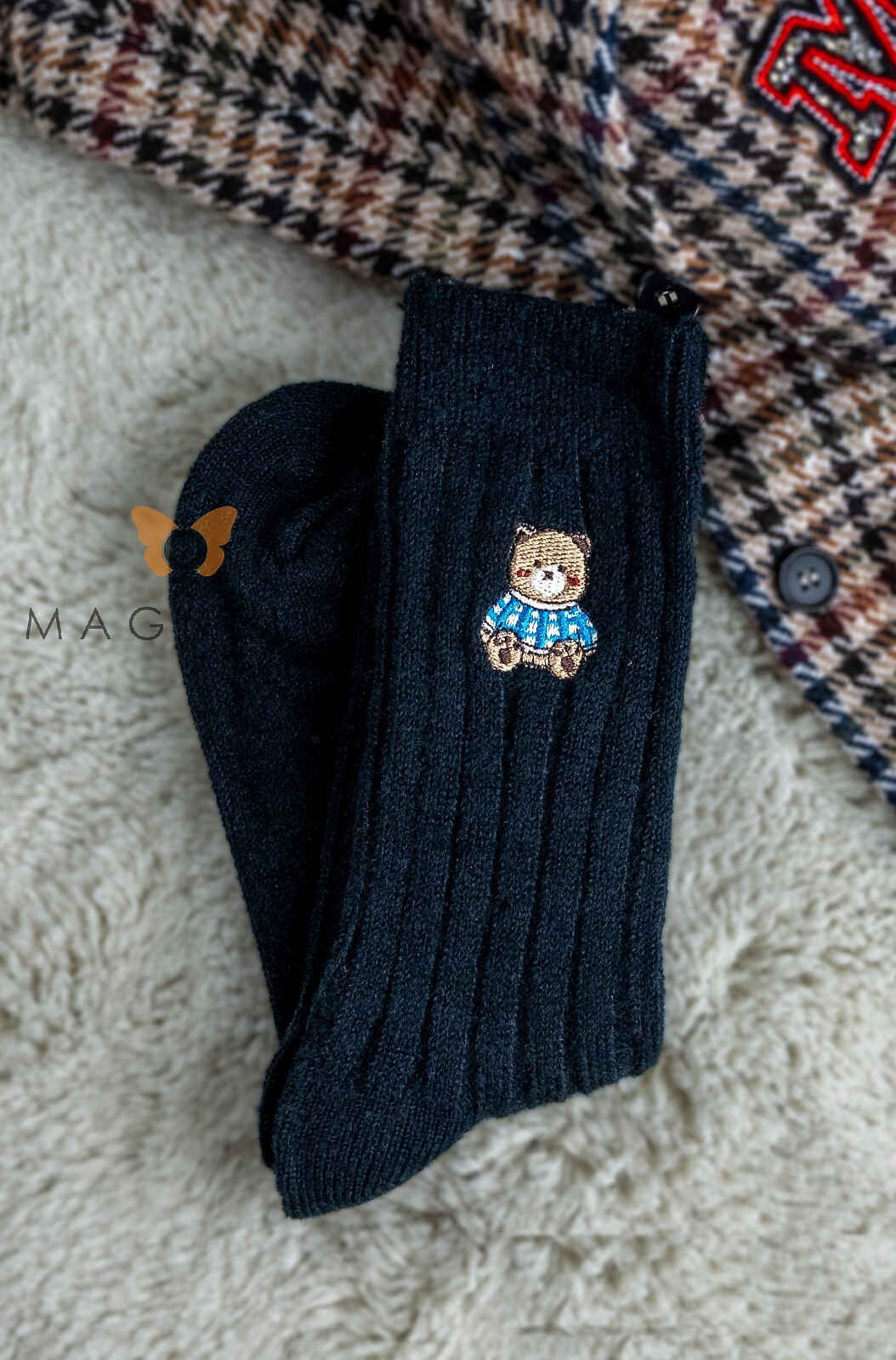 Teplé dámské ponožky - měkký žebrovaný úplet - svršek zdobený aplikací medvídka - nekompresní manžeta Složení: 65% bavlna, 13% viskóza, 13% vlna, 6% polyamid, 3% elastan