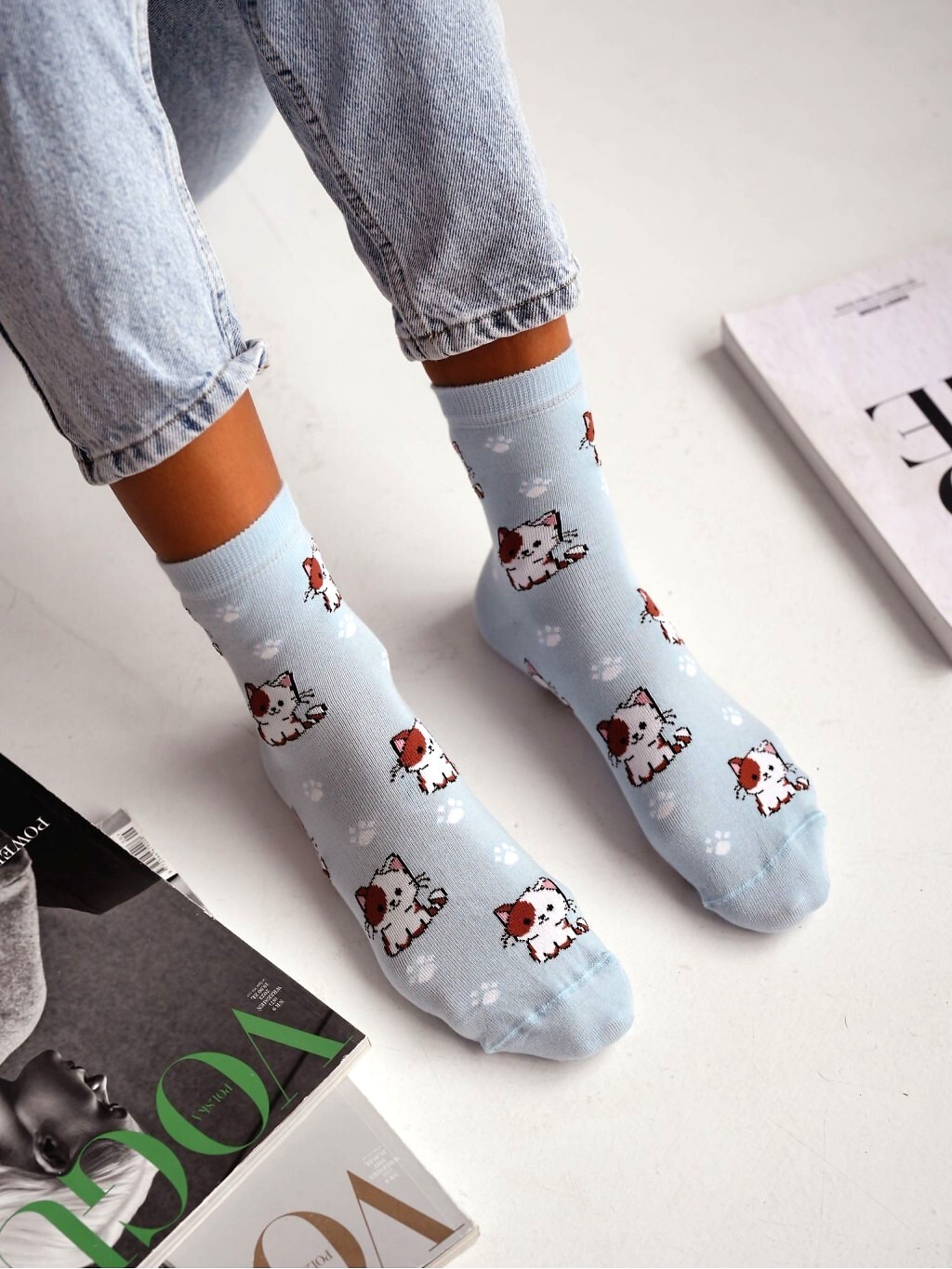 Dámské ponožky - vyrobené z vysoce kvalitní bavlněné příze - zdobené vzorem malých kočiček - ploché švy Složení: 75% bavlna, 20% polyamid, 5% elastan