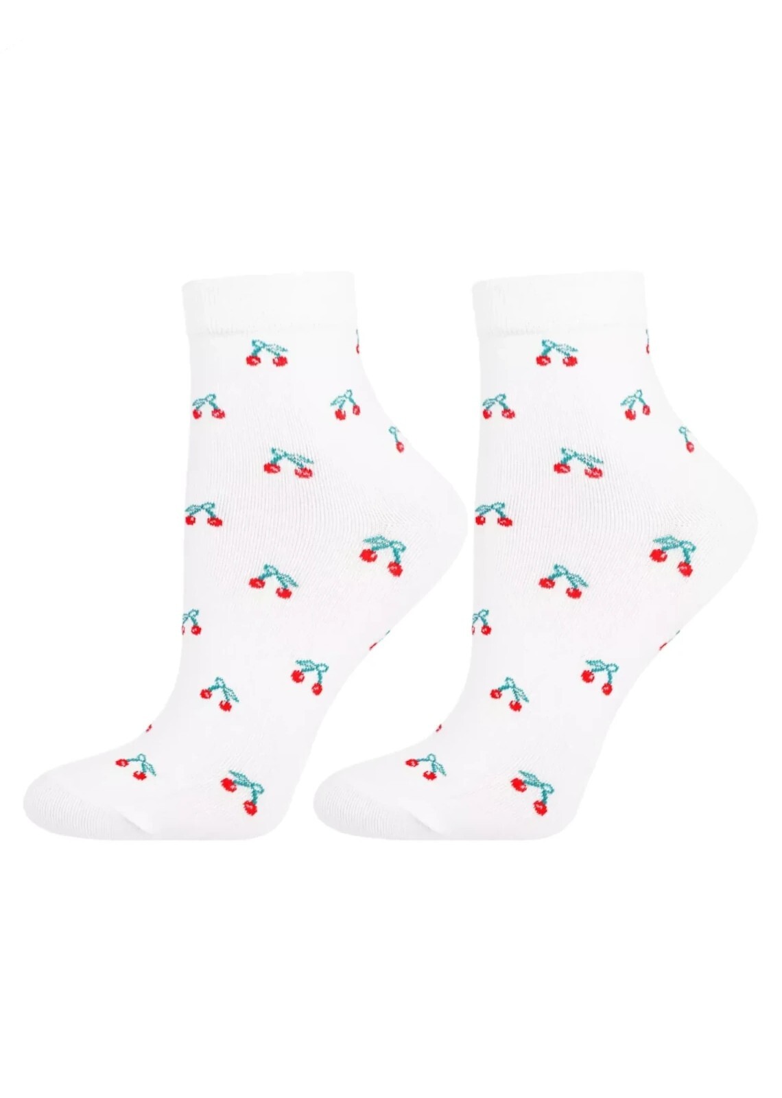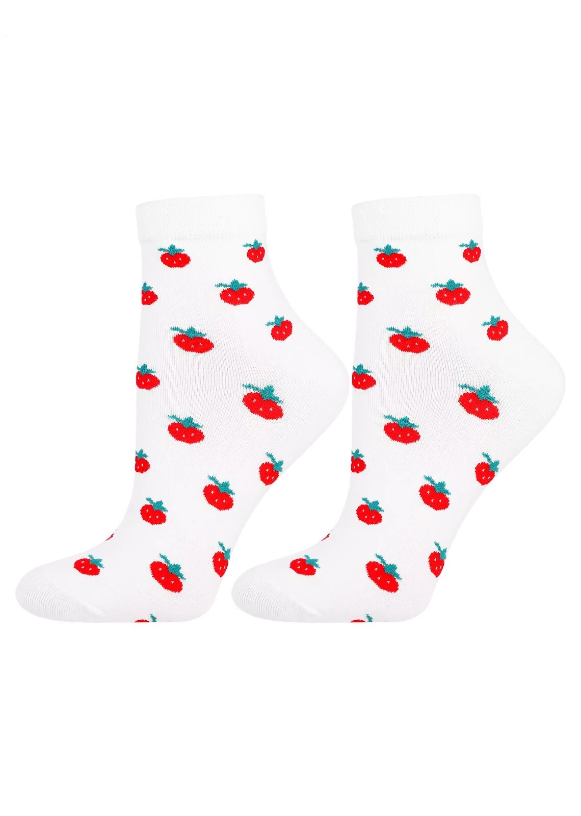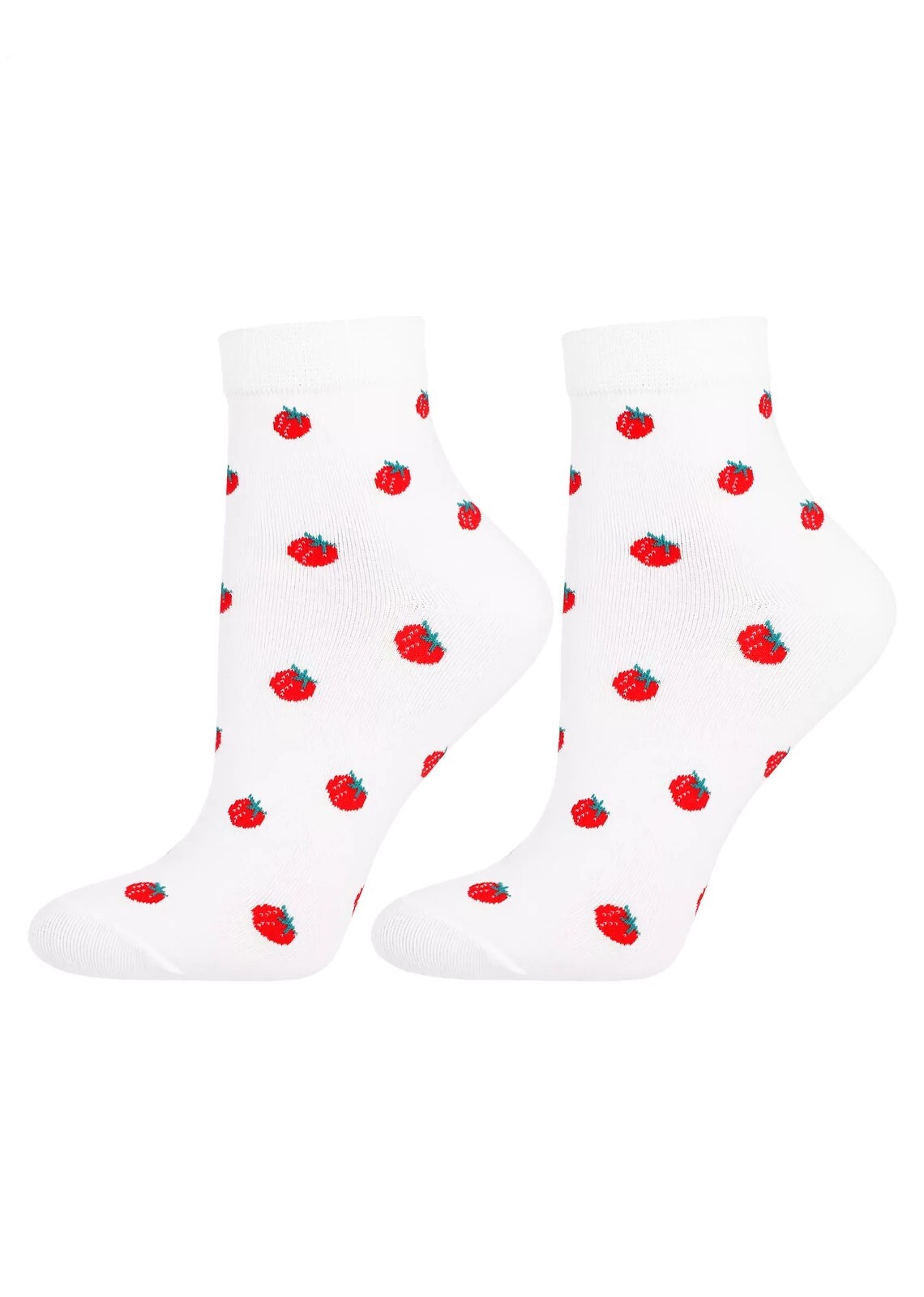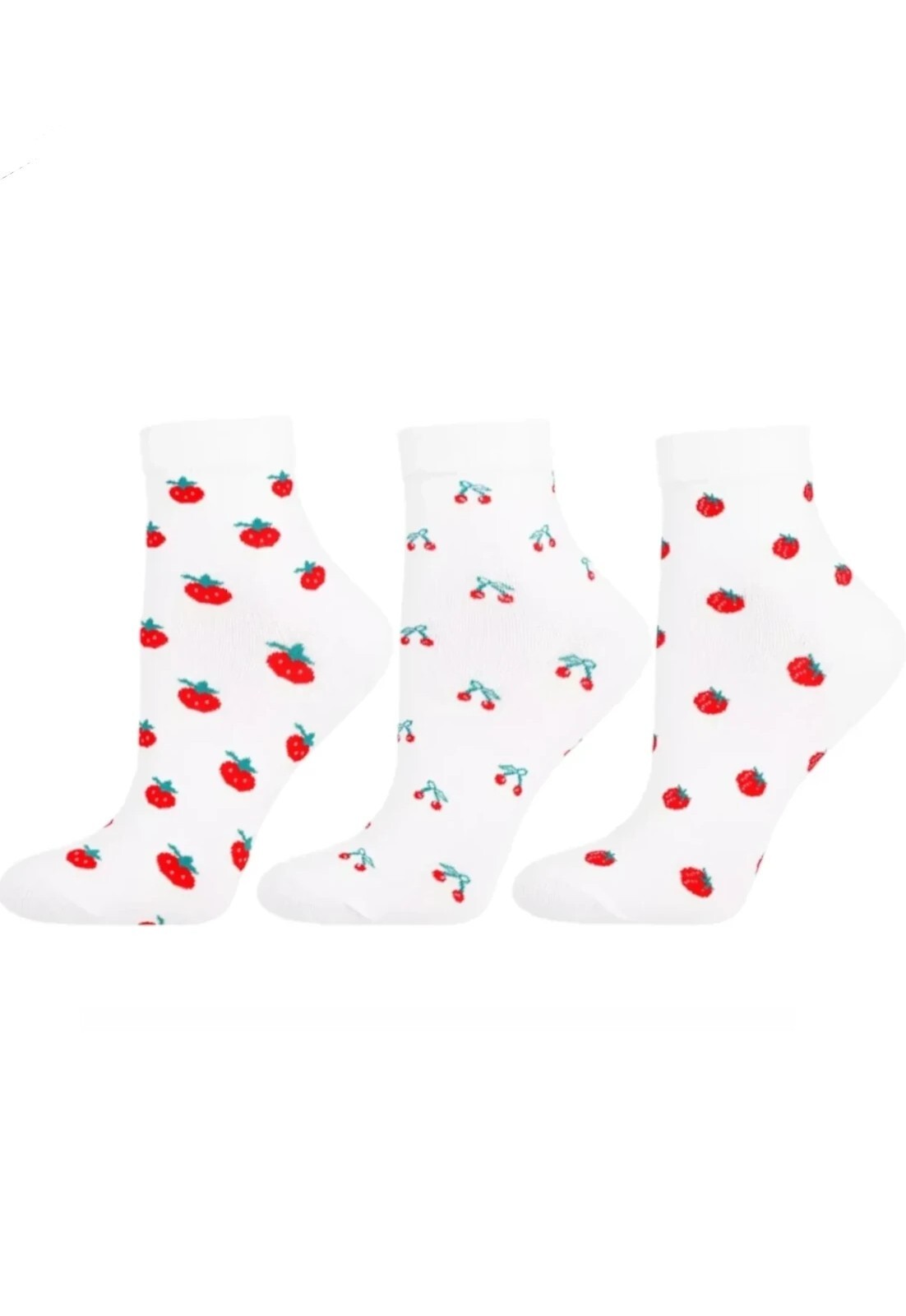 Dámské ponožky - vyrobené z vysoce kvalitní bavlny - ideální pro každodenní nošení - perfektně přizpůsobí noze - poskytují vysoký komfort nošení - dostupné v bílé barvě ve 3 vzorech: jahoda, malina, třešeň Složení: 69% bavlna, 28% polyamid, 3% elastan