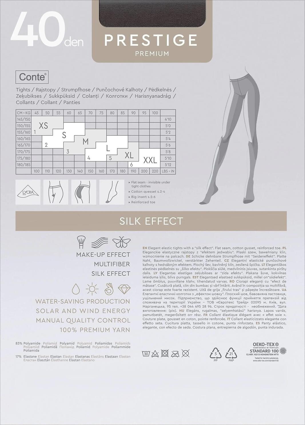 Hladké punčocháče s hedvábným efektem - 40 den - vyrobené z multifibry (multifilamentní nitě) - hedvábné a měkké na dotek, odolné - bez výrazné části kalhotek - opticky zeštíhlují a tvarují linii nohavic - ploché švy - velký klínek ve velikosti 5 XL - zesílené prsty Složení: 83% polyamid, 17% elastan