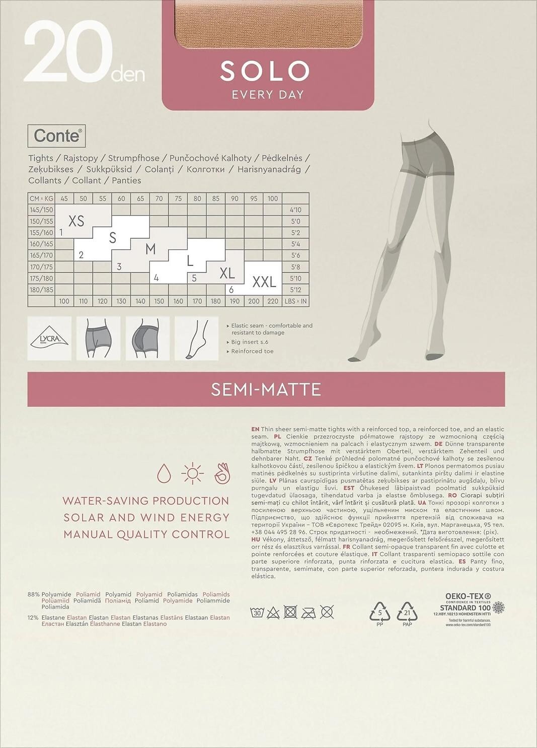 Klasické, hladké punčocháče - tloušťka 20 den - polomatné - poskytují pohodlí a praktičnost při používání - označená část kalhotek - zesílené prsty - ideální pro každodenní styling Složení: 88% polyamid, 12% elastan