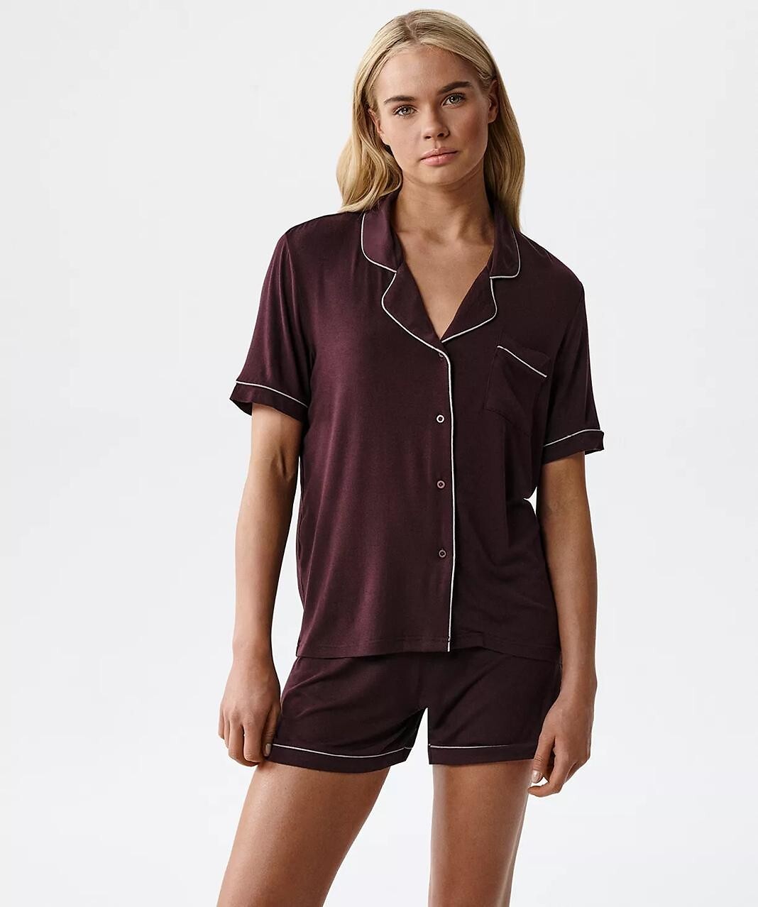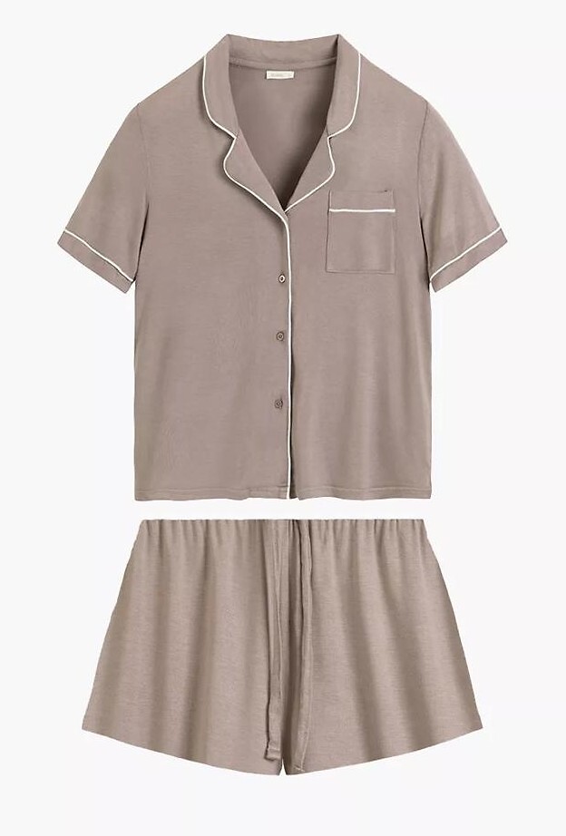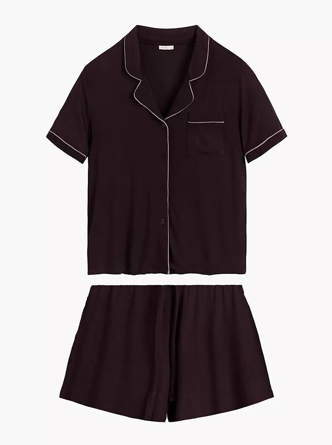 Dámské pyžamo - jemná tkanina z šetrného modalu - tričko s krátkým rukávem - s límečkem, zapínání na knoflíky - přišitá kapsa na hrudi - kraťasy součástí balení - pohodlný elastický pas a stahovací šňůrka pro nastavení obvodu Složení: 95% modal, 5% elastan