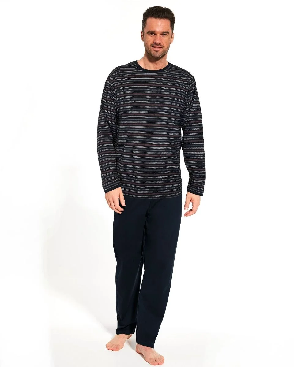 Pánské pyžamo – vyrobené z vysoce kvalitní bavlny – pruhované tričko s dlouhým rukávem – výstřih do U – ladící dlouhé hladké kalhoty – vzor jako na obrázku 2 Složení: tričko- 92% bavlna, 8% polyester, kalhoty- 100% bavlna