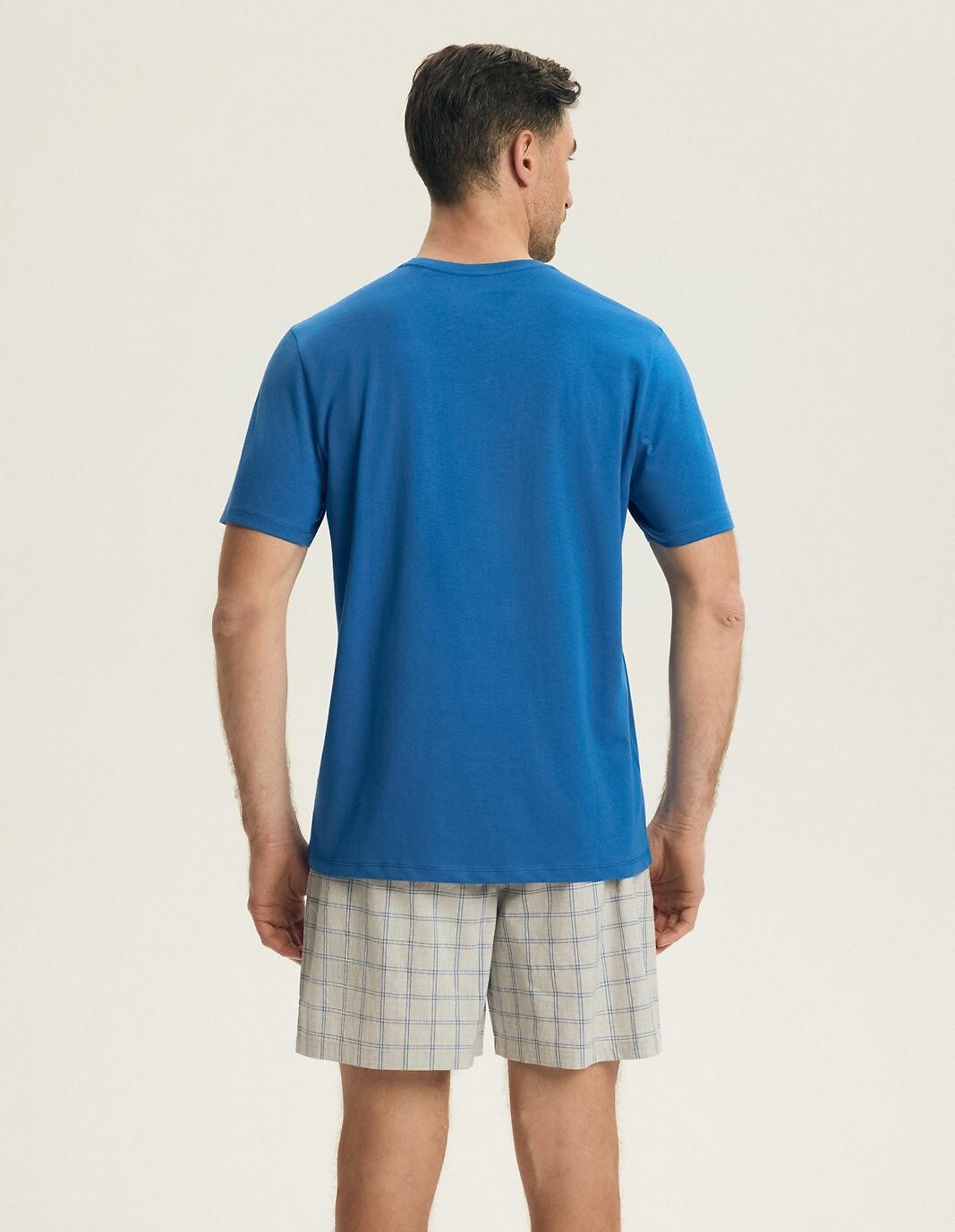 Pánské bavlněné pyžamo - hladké pletené tričko - kulatý výstřih - potisk na hrudi - kalhoty z tenké bavlněné tkaniny s kostkovaným vzorem - délka nad kolena - elastický pas a stahovací šňůrka pro nastavení obvodu pasu Složení: 100% bavlna